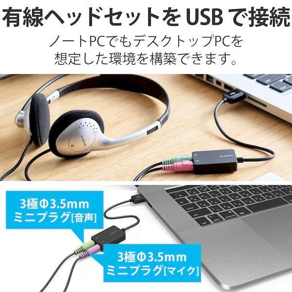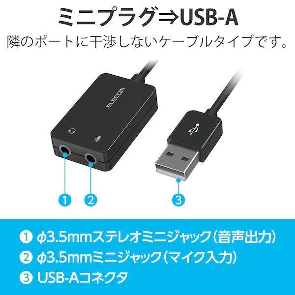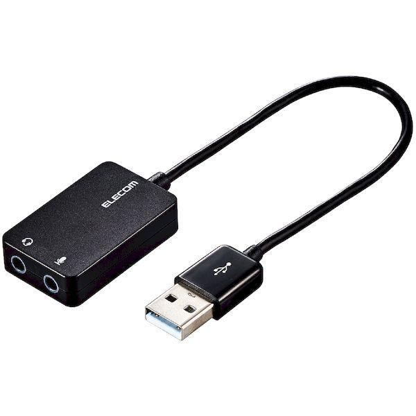 エレコムメーカーお問い合わせ:0120-898-794【商品説明】●オーディオ出力用φ3.5mmステレオミニジャック(3極、4極 両対応)とマイク入力用3極φ3.5mmミニジャックの2つの端子を搭載しています。●ヘッドホン端子とマイク端子が分離した従来のパソコン用ヘッドセットに加え、スマホ用4極φ3.5mmミニプラグ(CTIA規格)のマイク付きイヤホンにも対応しています。●マイク端子がないパソコンでも、パソコン用のヘッドセットおよびスマホ用のマイク付イヤホンを使用できます。●ノートパソコン、デスクトップパソコンおよび音声出力対応USB端子を搭載したゲーム機に接続することでヘッドホン、ヘッドセット、スピーカー、マイクなどが使えます。●中音域を明瞭に伝えるチューニングによって、環境ノイズを抑えたクリアな音声を通話相手に伝えることを可能にします。●サウンドカードやドライバは不要で、USBポートに差し込むだけの簡単接続です。●USBポートに接続することで、パソコン内部のノイズの影響を受けにくいデジタル伝送が可能です。●※本製品をぶら下げた状態での使用は避けてください。ケーブルが断線する恐れがあります。