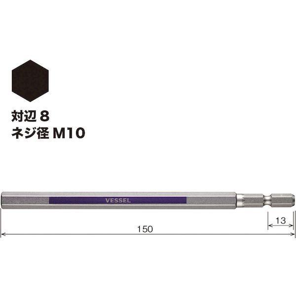 ベッセルメーカーお問い合わせ:0120-999-914【特長】●六角穴付きボルト、六角穴付き止めねじ用のビットです。●10色カラーでサイズを色分けし、ビットが選びやすくなっています。●ビット材はダイハード鋼(最高硬度HRC62)を使用しています。●強くてしなやかなで耐久性は抜群です。●六角面にカラー印刷しており、塗装品のようなにじみがなくシャープなエッジです。●精緻な刃先加工で高い嵌合性を実現しました。●刃先部分にはメッキや塗装がつかないためねじとの食いつきが良く、様々なねじにフィットします。【用途】●建築、電気、機械組立・整備、精密組立、DIYに。【仕様】●対辺(mm):8●全長(mm):150●刃先:マグネットなし●色:紫●セット内容(本):1【仕様2】●ダイハード鋼●先端:マグネットなし●差込軸:6.35mm●18Vインパクト対応●片頭【材質/仕上】●ダイハード鋼(最高硬度HRC62)【注意】●作業時は、保護メガネを着用してください。●必要以上に無理な力で使用しないでください。●工具は、本来の使用目的以外で使用しないでください。●電流が流れているものには使用しないでください。●正しい用途・サイズ・使い方を確かめてご使用ください。【原産国】日本