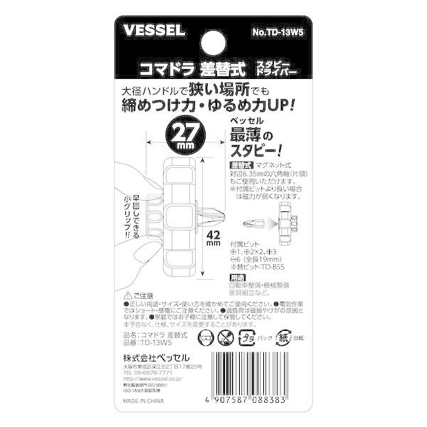 ベッセルメーカーお問い合わせ:0120-999-914【商品説明】●当社スタビードライバー最薄27mm。●早回しできる中央小径グリップ。●力が入る42mm外側大径グリップ。●六角対辺6.35mm片頭ビット差替式【用途】●自動車整備・機械整備、家具組立などに。●ビット:-6, +1, +2(2本), +3×10mm●ビットホルダー