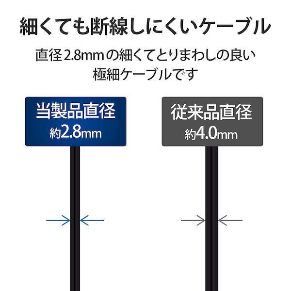 エレコムメーカーお問い合わせ:0120-898-794【商品説明】●USB-Aを搭載しているパソコン及び充電器、モバイルバッテリーなどに、USB Type-C(TM)を搭載しているスマートフォンやタブレットを接続し、充電やデータ転送ができるUSB2.0ケーブルです。※USB Type-C and USB-C are trademarks of USB Implementers Forum●直径2.8mmの細くてとりまわしの良い極細ケーブルを使用しています。●最大15W(5V/3A)の大電流で接続機器の充電が可能です。 ※ご使用になるパソコンなどの性能によって、供給される電流値が異なります。USB Power Delivery非対応です。●最大480Mbpsの高速データ転送が可能です。●難燃性の素材を使用し、安全性を高めています。●外部ノイズの干渉から信号を保護する2重シールドケーブルを採用しています。●サビなどに強く、信号劣化を抑える金メッキピンを採用しています。●EUの「RoHS指令(電気・電子機器に対する特定有害物質の使用制限)」に準拠(10物質)した、環境にやさしい製品です。●ゴミの少ない簡易パッケージです。