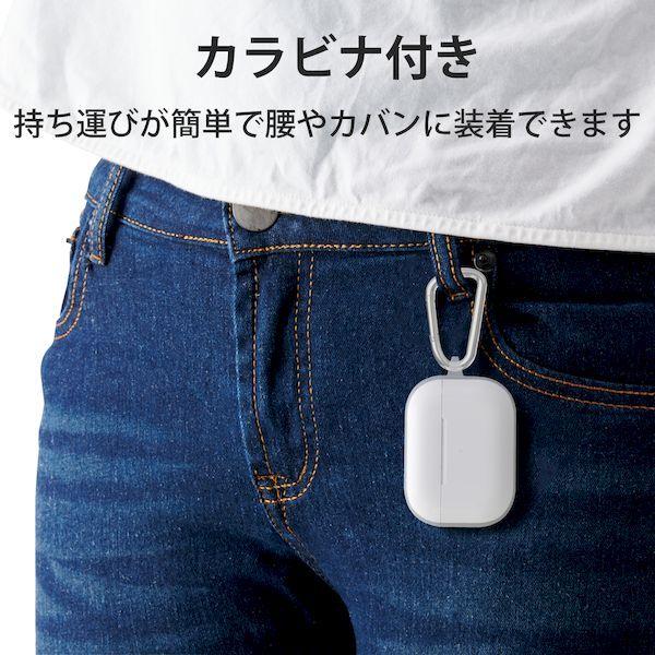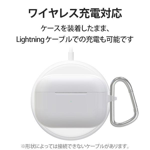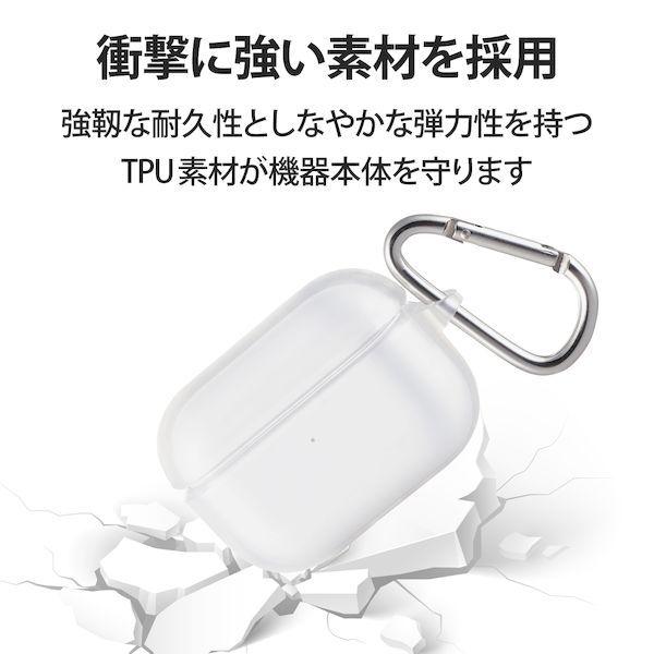 エレコムメーカーお問い合わせ:0120-898-794【商品説明】●耐久性と弾力性を合わせ持ったTPU(熱可塑性ポリウレタン)素材を使用した、本体デザインを損なわず、美しさが際立つAirPods Pro用ソフトケースです。●ケースと一体型のコネクタキャップが、Lightning端子部を保護します。●充電ケースのフタ部分までカバーして保護しています。●シリコン素材より強く耐久性に優れ、プラスチック素材よりしなやかな弾力性を持つTPU(熱可塑性ポリウレタン)素材を使用しています。●ケースを装着したまま、ワイヤレス充電または、Lightningケーブルでの充電が可能です。※形状によっては接続できないケーブルがあります。●ケース装着時でもインジケータランプの確認ができます。●背面RESETボタンに対応します。●持ち運びしやすく、腰やカバンに装着できるカラビナをケース側面につけました。