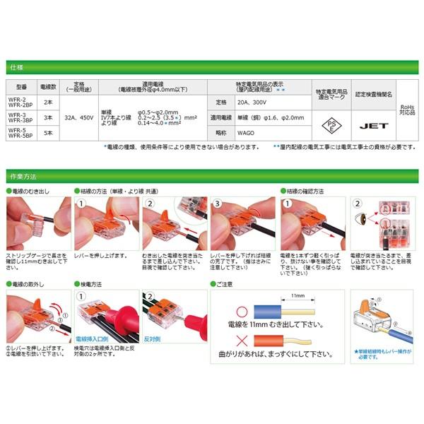 【商品説明】【特長】単線もより線もレバー操作でワンタッチ接続できます。工具不要で非常に便利です。ハウジングが透明で電線挿入が目視確認できます。【仕様】色:オレンジ差込線数(本):2適合電線(より線)(m[[M2]]):0.14~3.5適合電線(単線)(mm):φ0.5~2.0定格:特定電気用品(PSE) 300V、20A JIS適合450V、32A 電線むき長さ:11mm【材質/仕上】ポリカーボネート銅ステンレスWFR-2 より線・単線ワンタッチ接続可能コネクタ 2穴用 100個入 WFR-2質量197(g)原産国ドイツ