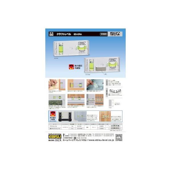 エビスメーカーお問い合わせ:0120-18-5133【商品説明】●特徴●透明型の水平器です。●透明なので、透かして測れます。●全面が測定面として利用できます。●薄型・軽量で携帯に便利です。●額縁(横長・縦長)の掲示作業の水平出しに便利です。●樹脂製なので測定物に傷がつきにくいです。●突っ張り棚等の壁面棚取り付け作業の水平出しに便利です。●シェルフ・ラック等の足場調整時の平面出しに便利です。●磁石が内臓されているので液晶テレビやエアコンプレート等、壁面取り付け金具の水平出しに便利です●磁石付きなので壁掛けボードの設置時に両手で作業できます●仕様、規格●素材:アクリル樹脂●2本線型アクリル気泡管●水平・垂直・直角測定可能●感度:0.50mm/m=0.0286°●精度:±2.50mm/m=±0.1432°以内●本体サイズ:12x30x75mm●製品質量:27g●本体:透明●気泡管カラー:グリーン●マグネット付き