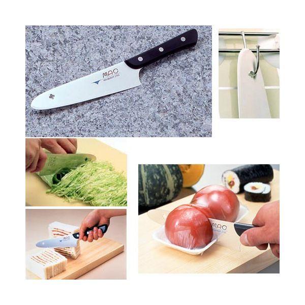 マックメーカーお問い合わせ:06-6971-1701【商品説明】●MAC オリジナル●全国の主婦が絶賛!●一度使うともう手放せない!軽くて切れ味が良く、ハンドルがヒップアップしているので、力を入れやすく、扱いやすい。●人間工学から生まれたマックオリジナルデザインシリーズ。●刃先が丸く安全に使用頂ける点が特徴的です。●刃先の穴はフックに引っ掛けると乾燥も早く衛生的です。食材がくっつきにくくもなっています。●ハンドルは3つ止めですから、耐久性も高い仕様です。●鋼材が柄の後端まで貫通しているので、バランスがよく持ちやすい。●刃が、小振りなので1~3人の小人数のご家族向きです。●はじめて包丁を使用される方や年配の方に最適です。●サイズ:170mm●全長:290mm●刃厚:1.5mm●重さ:115g●材質:鋼材/クローム・モリブデン綱、柄/積層合板