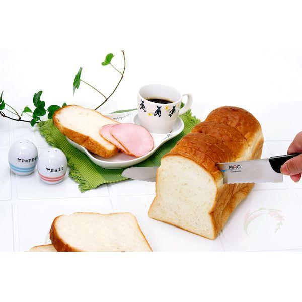 マックメーカーお問い合わせ:06-6971-1701【商品説明】●『真久作』スーペリアシリーズ●切れ味は鋭く、特殊加工を施した波刃がしっかりと食材をとらえ、切りにくい焼きたてのパン、具をたっぷり挟んだサンドイッチ、太巻きにも威力を発揮します。●食パンやフランスパンなどを切るのに便利な大きめのパン切り包丁です。●大きなピザやパウンドケーキもスイスイ切れます。ハム・ソーセージ・ローストビーフ・焼き豚などを薄くスライスするにも便利です。●サイズ:270mm●全長:390mm●刃厚:2.0mm●重さ:165g●材質:鋼材/超硬モリブデン綱(サブゼロ処理)、柄/積層合板
