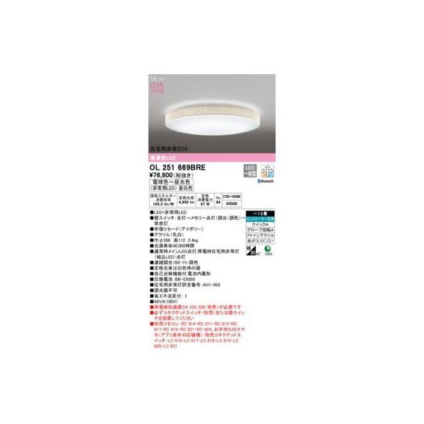 オーデリックメーカーお問い合わせ:03-3332-1123【商品説明】消費電力47W Ra94 ●LED+非常用LED ●壁スイッチ:全灯→メモリー点灯(調光・調色)→常夜灯 ●張りセード(アイボリー)●アクリル(乳白) ●巾φ596 高112 2.4kg ●光源寿命40,000時間 ●通常時メインLED点灯,停電時住宅用非常灯(組込LED)点灯 ●連続調光100-1%・調色 ●定格光束は白色時の値 ●自己点検機能付,電池内蔵形 ●交換電池:BB-03050 ●住宅用非常灯評定番号:AH1-003 ●調光器不可 ●停電検知装置OA 253 300(別売)が必要です ●必ずコネクテッドスイッチ(別売)または壁スイッチを設置してください ●リモコン別売:別売BT調光・調色リモコン居室CL用+別売コネクテッドスイッチ ~12畳 リモコン別売 クイックA グローブ回転A ファインアクリル 虫が入りにくい 105% 45° 省エネ達成率 傾斜天井対応 その他
