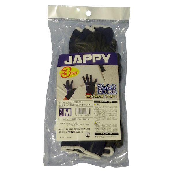 JAPPYメーカーお問い合わせ:06-6531-2747【商品説明】●とにかく軽くて薄い、フィット感抜群の使い勝手の良い手袋●商品コード:690-930-00510●品番:JPS-178B-3PM 3ソウイリ●材質(手袋):ナイロン●材質(すべり止め):ポリウレタン樹脂●色(手袋):ネイビー色●色(すべり止め):黒色●オーバーロック色:白色●サイズ:M●全長:225mm●幅:85mm●中指長:74mm●カフス幅:70mm