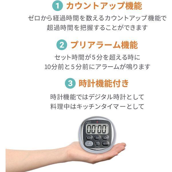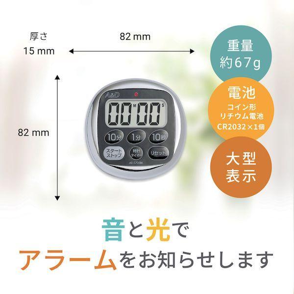 エー・アンド・デイメーカーお問い合わせ:03-5391-6126【特長】●100分形、防滴タイマーです。●ブザー音とランプでアラームをお知らせします。●文字高約18mmの見やすい液晶表示です。●カウントアップ機能、プリアラーム、時計機能、マグネット付です。【用途】●学校、家庭、職場などあらゆる用途に対応【仕様】●最大計時:99分50秒●最小計時(秒):10●電源:コイン型リチウム電池(CR2032)×1個(付属)【仕様2】●縦×横×厚さ:82×82×15mm【原産国】中国