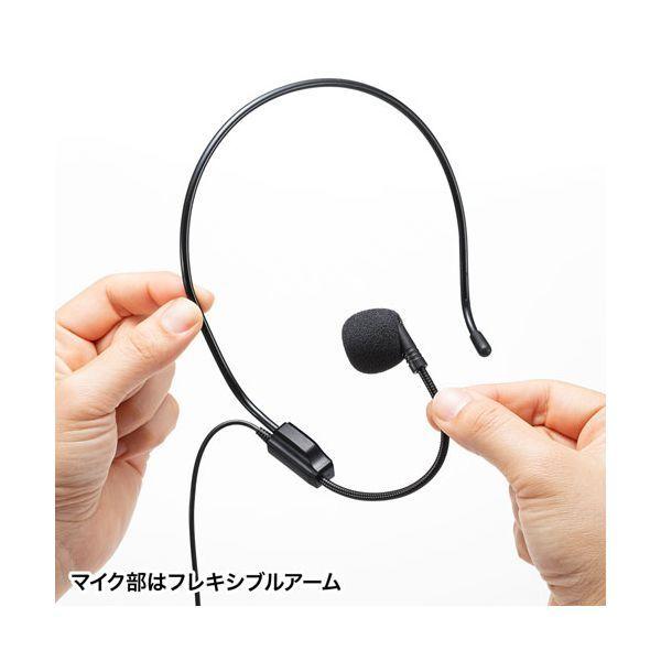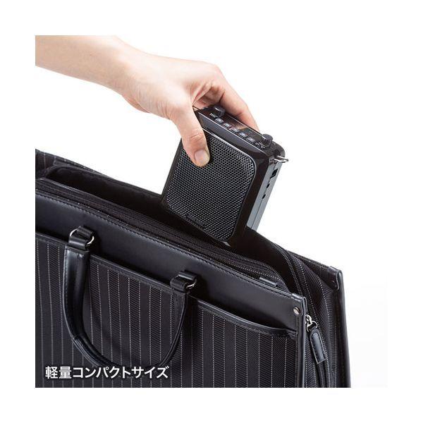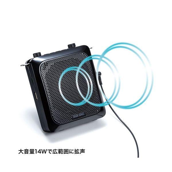【商品説明】●最大出力14Wでしっかり声を届けることができるポータブル拡声器スピーカー●体にスピーカーとヘッドマイクを装着することで両手が自由に使えるハンズフリー拡声器スピーカーです。 ●軽量でコンパクトサイズなので、ツアーガイドやイベント、講義や店頭販売など様々なシーンでアクティブに使用することができます。●実用最大出力14Wのハイパワーで大きな音量ではっきりと拡声させることができます。●ヘッドマイク付きでマイク部はフレキシブルアームとなっており自由に動かすことができます。●USBメモリやmicroSDカードに保存されたMP3音楽データを再生可能です。同時にマイク音声出力もできます。●外部音声入力も搭載しており、スマートフォン・iPhoneからの音楽再生をしながら同時にマイク音声出力することも可能です。●エコー効果調整機能も搭載しており自分の声にエコーをかけることが可能です。※本製品は防水構造ではありません。※屋外での使用目安として40人程度、屋内の比較的静かな環境では70人~80人程度への案内が可能です。<スピーカー部>●実用最大出力:14W ●周波数特性:90~18000Hz●スピーカー形式:密閉式フルレンジスピーカーシステム●スピーカーユニットサイズ:4インチ(直径約91.5mm)●ロードインピーダンス:4Ω●マイク入力:3.5mmマイクジャック●外部入力:3.5mmステレオミニジャック(LINE IN)USBメモリ、microSDカード(32GB以下)●電源:内蔵リチウムイオン電池(7.0V 2000mA)●充電方法:ACアダプタ DC5V/1000mA●充電時間:約3時間●連続使用時間:マイク使用で約10~12時間程度(中間音量)音楽再生で約8~10時間程度(中間音量)●材質:ABS樹脂●サイズ:W99×D48×H123mm●重量:約346g●セット内容:拡声器スピーカー×1、ヘッドマイク×1、ネックストラップ×1、3.5mmステレオミニプラグ(オス・オス)ケーブル×1、ACアダプタ(DC5V 1A)×1、取扱説明書<マイク部>●型式:単一指向性エレクレット型●周波数特性:30~23000Hz●入力信号:ケーブルマイク(-41dB~±1dB)(0db=1V/Pa)●動作電圧:1.35V~3.3V●S/N比:58dB以上●消費電流:0.5mA以下(供給電圧3V)●インピーダンス:2.2kΩ(1kHz)●重量:約30g●ケーブル長:約1m