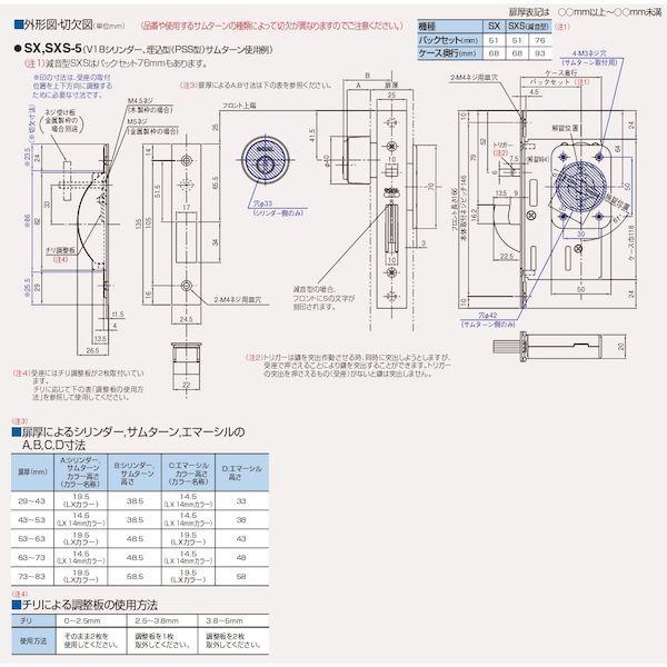 【商品説明】防犯性・操作性・耐久性をさらにアップした引戸鎌錠です。【仕様】●シリンダー:6本ピンシリンダー●バックセット:51mm●取付可能扉厚:29mm以上~43mm未満●チリ寸法:5mm以下(受座にはチリ調整板が付いています。)●室内側:埋込型PSS型サムターン●室外側:シリンダー●受け金具付き●キー3本付き【特長】●デッドボルト(鎌)は堅牢でシリンダーの取付けは頑丈。●トリガー(安全装置)付。施錠する際、扉を閉めるとウケでトリガーを押すことにより鎌を突出(施錠)することが可能です。トリガーを押さないと鎌は突出できないため、誤って鎌を突出させたまま扉を閉め、枠側を損傷することはありません。また、トリガーは押すことで錠本体へ後退するため、トリガーで枠側を損傷することもありません。
