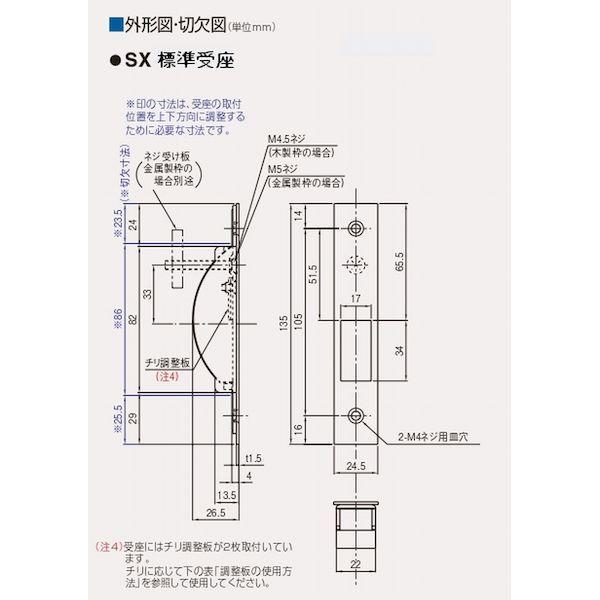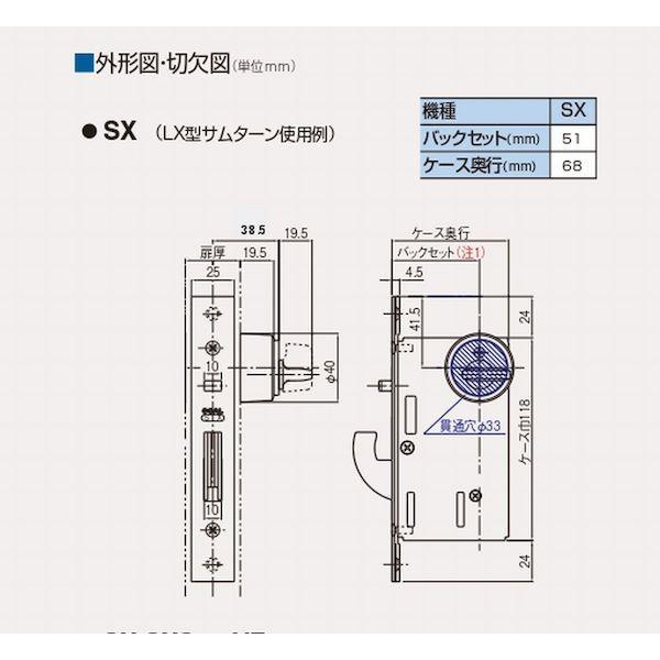 【商品説明】防犯性・操作性・耐久性をさらにアップした引戸鎌錠です。【仕様】●バックセット:51mm●取付可能扉厚:29mm以上~43mm未満●チリ寸法:5mm以下(受座にはチリ調整板が付いています。)●室内側:LX型サムターン●受け金具付き【特長】●デッドボルト(鎌)は堅牢でシリンダーの取付けは頑丈。●トリガー(安全装置)付。施錠する際、扉を閉めるとウケでトリガーを押すことにより鎌を突出(施錠)することが可能です。トリガーを押さないと鎌は突出できないため、誤って鎌を突出させたまま扉を閉め、枠側を損傷することはありません。また、トリガーは押すことで錠本体へ後退するため、トリガーで枠側を損傷することもありません。
