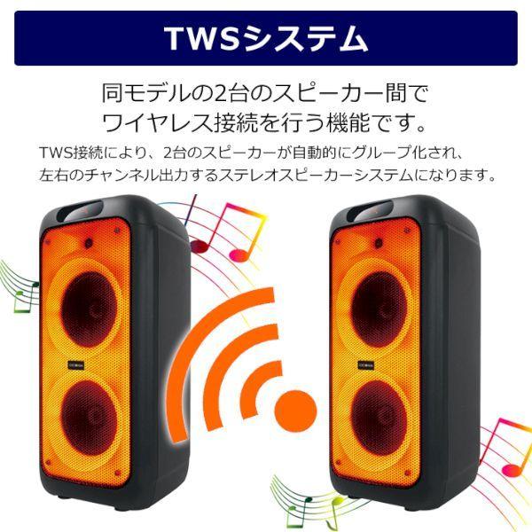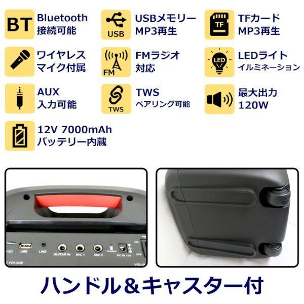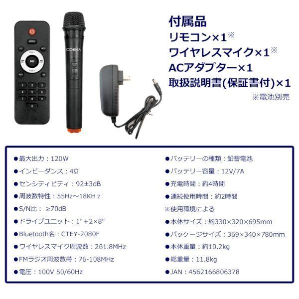【商品説明】●バッテリー内蔵!LEDイルミネーション搭載の目でも楽しめる、フレイムLEDパーティースピーカー。●120Wの迫力あるサウンド!●入力端子はAUX・ギター・マイク・USB・microSDと幅広くカバー!●Bluetooth対応のスマートフォンやメディアプレイヤー、USBメモリー、microSDカードから音楽データを再生可能。●ハンドル&車輪付きなので、どこでも持ち運べて便利。●会議やセミナー、イベントやアウトドアに、様々な場所で使えます。●ワイヤレスマイク1本、リモコンも付属しています。●FMラジオも聞けます!●TWSシステム搭載、同モデルのスピーカー2台をワイヤレスで接続可能。●最大出力120W●インピーダンス4Ω●センシティビティ92±3dB●周波数特性55Hz~18KHz●S/N比≧70dB●ドライブユニット1”+2×8”●マイク周波数268.1MHz●FMラジオ周波数帯76.0~108.0MHz●電源AC100V 50/60Hz●バッテリー容量12V 7A●バッテリー種類鉛蓄電池●充電時間約4時間●連続使用時間約2時間※使用環境による●本体サイズ約330×320×695mm●重量約10.2kg●パッケージサイズ369×340×780mm●総重量11.8kg●付属品ワイヤレスマイク×1(電池別売:単3×2)リモコン×1(電池別売:単4×2)ACアダプター×1取扱説明書(保証書付)×1CICONIA フレイム LED パーティー スピーカー CTEY-2080F ワイヤレスマイク 1本付 リモコン Bluetooth LEDライト 室内 屋内 屋外 野外 アウトドア 会議 音楽再生 カラオケ ポータブルスピーカー PAスピーカー