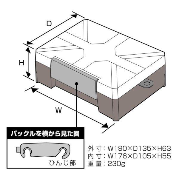 【商品説明】●特徴●厚さ1.7倍(当社従来品比較)で頑丈、極厚設計3mmの収納ケース●1,000kgの荷重に耐える(上面全体に荷重をかけた数値)●バックルを付け替えて開け方2種類●積み重ねできるスタッキング溝付●仕様、規格●サイズ 外寸 W190×D135×H63 内寸 W176×D105×H55●重 量 230g●材質 PP