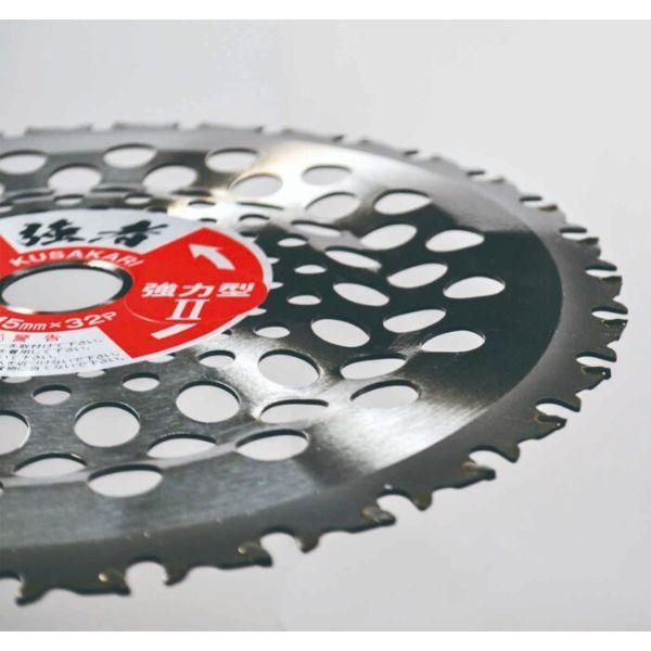 ●強者の「石の飛散が少ない」特徴を最大限にいかした深刈タイプ 強力型II ジズライダーなどを装着するケースが多くなり、刈払機を少し浮かした状態で草刈作業をしているので、深く刈り込めないと云う要望に応え、日本で二段曲加工を施した商品を開発。通常下に曲げた場合は、チップが石を多く飛散するが、強者は石等の飛散を減少出来るので深刈タイプが可能。