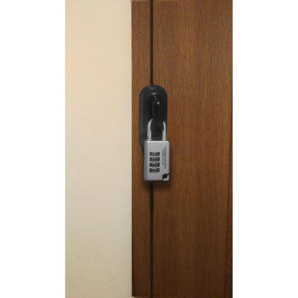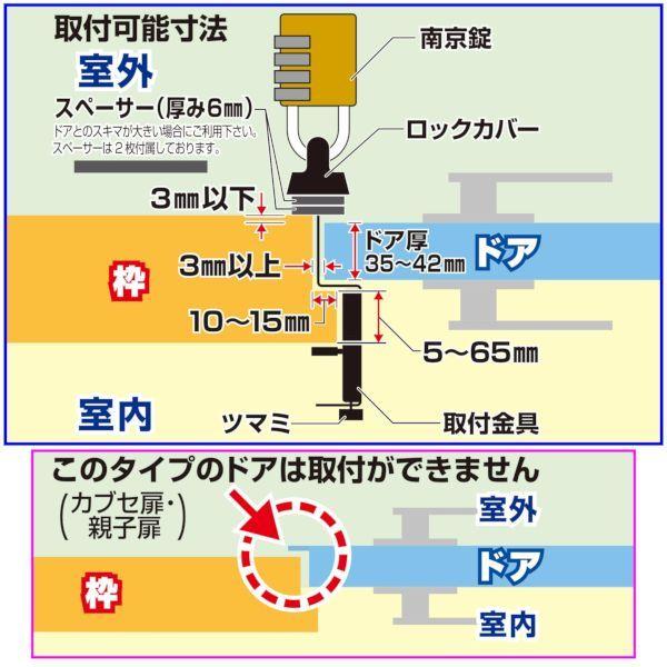 【商品説明】●南京錠で扉を施錠できます。●物件管理に最適!●外開きドア用です。●ロックカバーが金具先端まで被うので、金具でキズ付く事はありません。●マグネットシート付きで、使わないときはスチールドアに取り付けて収納できます!●「内開きドア」の室内側に取り付けると、通常の玄関ドアの錠前以外に、ドアを施錠する鍵としてお使いいただくことができ、「屋外の徘徊防止」にもおススメです。【商品用途】●物件管理に!【注意】●南京錠のシャックルを解錠状態で反対方向に180度向けた時に、本体とシャックル先端の間が10mm以上ある南京錠をご使用ください。●適応ドア厚は35~42mmです。【材質】●本体ロックカバー・ステンレス・ABS樹脂、取付金具・ステンレス、スペーサー・EPDM樹脂、マグネットシート・合成ゴム取付け式