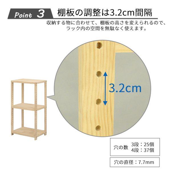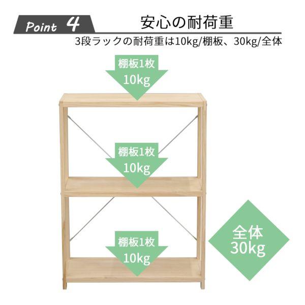 エイ・アイ・エスメーカーお問い合わせ:0280-98-5171【商品説明】●天然木を使用したシンプルな3段収納ラック。●サイズは選べる6サイズ(幅3種類、高さ3種類)。収納する物やお部屋に合わせてお選びいただけます。●本棚として、ディスプレイラックとして、インナーボックスを入れるなど、色々な収納に。●棚は32mmピッチで高さ調整が可能。背面にグラつきを抑えるクロスバー付き。●脚裏には傷防止のフェルト付き。●オプション棚を使って、ラック本体同士を連結し、オリジナルのラックを作ることができます。●無塗装の天然木を使用しているので、経年の色の変化を楽しめます。●お好きな色にペイントしてもOK。●収納力アップに、ディスプレイラックとしてなど、楽しみ方は色々。可能性が広がるラックです。●主材:フレーム・棚板/天然木(無塗装)、クロスバー/スチール●本体サイズ:幅82×奥行30×高さ83cm●その他サイズ:天板サイズ(約)/幅79×奥行30×厚み2.6cm、棚板調整用穴:25個、穴ピッチ:32mm、穴の直径7.7mm●耐荷重(約):棚板10kg/枚、全体30kg●組立:お客様組立品●中国製オープンラック オープンシェルフ 天然木 パイン 木製 ディスプレイラック 北欧 木目 おしゃれ シンプル 本棚 ブックシェルフ 書棚 収納棚