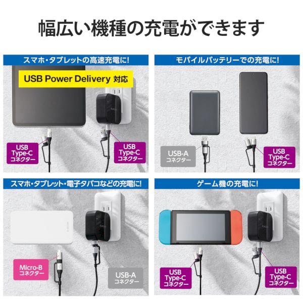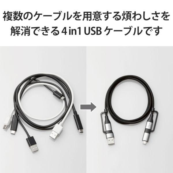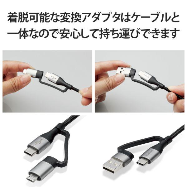 エレコムメーカーお問い合わせ:0120-898-794【商品説明】●機器に合わせてコネクターを付け替えられる4in1 USBケーブルです。データ転送や充電のために機器のコネクターに合わせて複数のケーブルを用意する煩わしさを解消できます。●変換アダプターを着脱することで、USB Type-C(TM)端子搭載機器、USB Micro-B端子搭載機器をACアダプター、モバイルバッテリーのポートに合わせ、接続して充電/データ通信することができます。●※iPadはパソコンからは充電できません。●USB PD(USB Power Delivery)に対応し、最大60W(20V/3A)の大電流を送電可能です。●※USB Type-C(TM) to USB Type-C(TM)使用時●※USB Type-C and USB-C are trademarks of USB Implementers Forum●最大480Mbpsの高速データ転送が可能です。●外部ノイズの干渉から信号を保護する2重シールドケーブルを採用しています。●難燃性の素材を使用し、安全性を高めています。●サビに強く信号劣化の少ない金メッキピンコネクターを採用しています。●ゴミの少ない簡易パッケージです。●EUの「RoHS指令(電気・電子機器に対する特定有害物質の使用制限)」に準拠(10物質)した、環境にやさしい製品です。●自社環境認定基準を1つ以上満たし、『THINK ECOLOGY』マークを表示した製品です。●環境保全に取り組み、製品の包装容器におけるプラスチック重量を、社内基準製品より20%以上削減した製品です。●環境保全に取り組み、製品の包装容器が紙・ダンボール・ポリ袋のみで構成されている製品です。