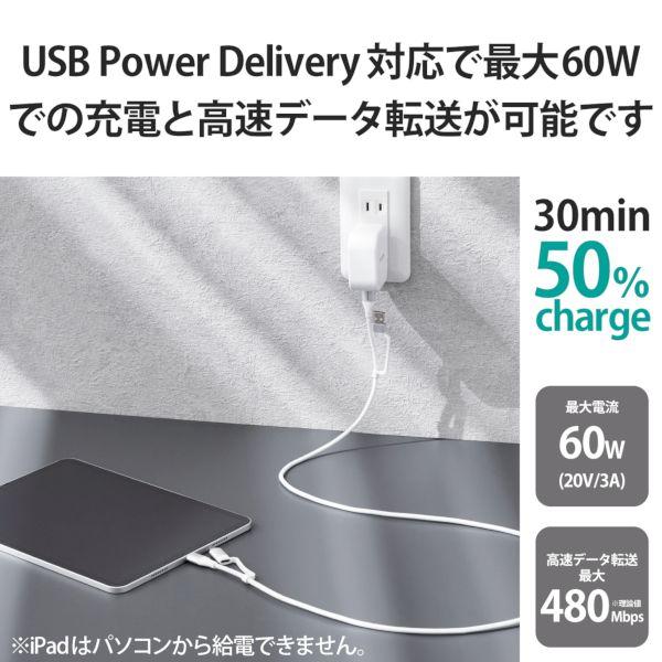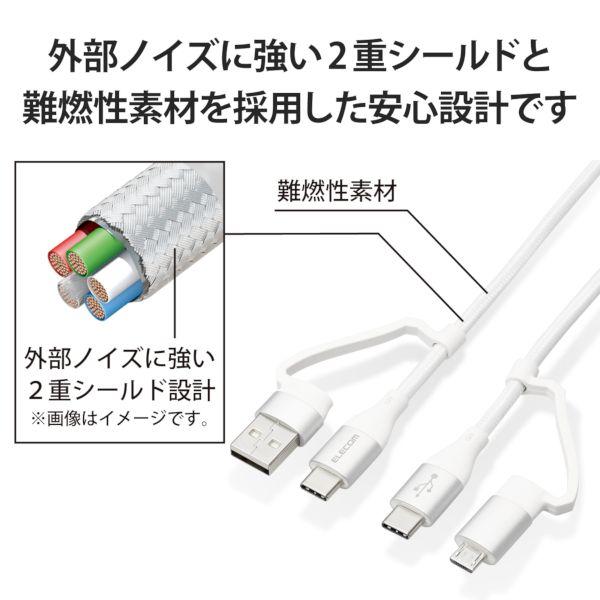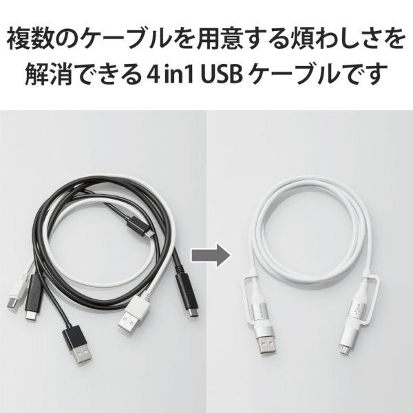 エレコムメーカーお問い合わせ:0120-898-794【商品説明】●機器に合わせてコネクターを付け替えられる4in1 USBケーブルです。データ転送や充電のために機器のコネクターに合わせて複数のケーブルを用意する煩わしさを解消できます。●変換アダプターを着脱することで、USB Type-C(TM)端子搭載機器、USB Micro-B端子搭載機器をACアダプター、モバイルバッテリーのポートに合わせ、接続して充電/データ通信することができます。●※iPadはパソコンからは充電できません。●USB PD(USB Power Delivery)に対応し、最大60W(20V/3A)の大電流を送電可能です。●※USB Type-C(TM) to USB Type-C(TM)使用時●※USB Type-C and USB-C are trademarks of USB Implementers Forum●最大480Mbpsの高速データ転送が可能です。●外部ノイズの干渉から信号を保護する2重シールドケーブルを採用しています。●難燃性の素材を使用し、安全性を高めています。●サビに強く信号劣化の少ない金メッキピンコネクターを採用しています。●ゴミの少ない簡易パッケージです。●EUの「RoHS指令(電気・電子機器に対する特定有害物質の使用制限)」に準拠(10物質)した、環境にやさしい製品です。●自社環境認定基準を1つ以上満たし、『THINK ECOLOGY』マークを表示した製品です。●環境保全に取り組み、製品の包装容器におけるプラスチック重量を、社内基準製品より20%以上削減した製品です。●環境保全に取り組み、製品の包装容器が紙・ダンボール・ポリ袋のみで構成されている製品です。