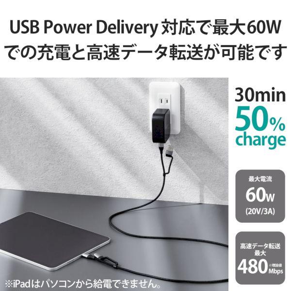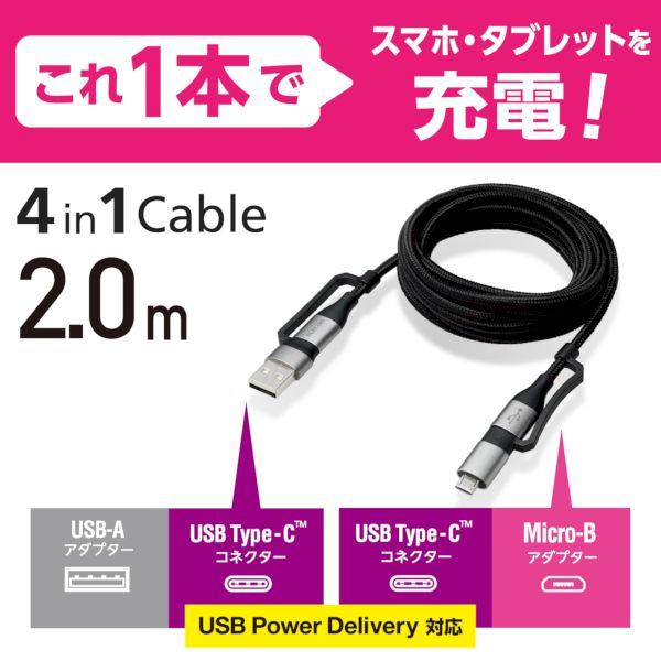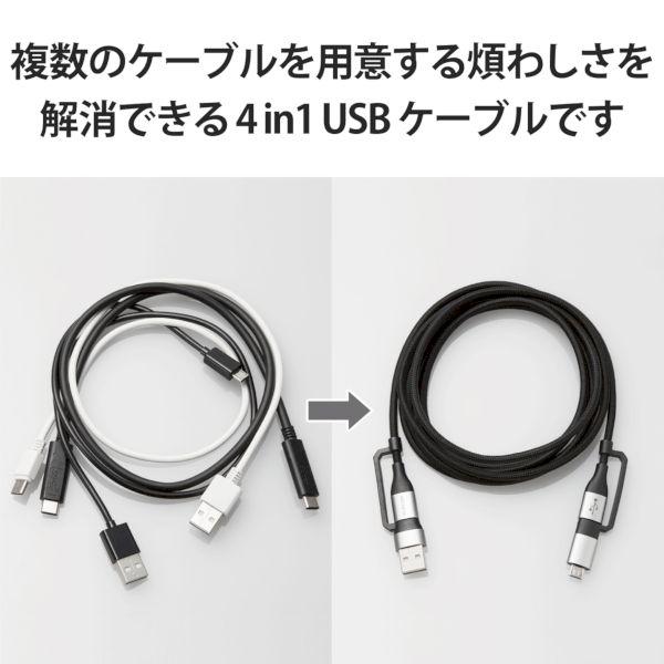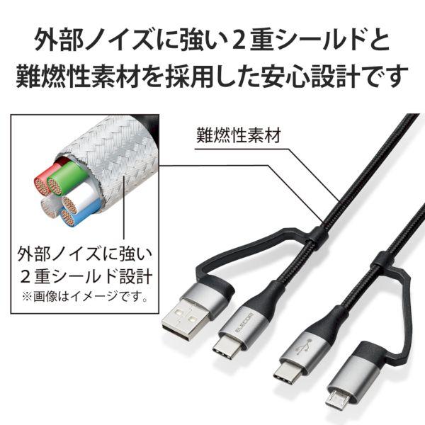 エレコムメーカーお問い合わせ:0120-898-794【商品説明】●機器に合わせてコネクターを付け替えられる4in1 USBケーブルです。データ転送や充電のために機器のコネクターに合わせて複数のケーブルを用意する煩わしさを解消できます。●変換アダプターを着脱することで、USB Type-C(TM)端子搭載機器、USB Micro-B端子搭載機器をACアダプター、モバイルバッテリーのポートに合わせ、接続して充電/データ通信することができます。●※iPadはパソコンからは充電できません。●USB PD(USB Power Delivery)に対応し、最大60W(20V/3A)の大電流を送電可能です。●※USB Type-C(TM) to USB Type-C(TM)使用時●※USB Type-C and USB-C are trademarks of USB Implementers Forum●最大480Mbpsの高速データ転送が可能です。●外部ノイズの干渉から信号を保護する2重シールドケーブルを採用しています。●難燃性の素材を使用し、安全性を高めています。●サビに強く信号劣化の少ない金メッキピンコネクターを採用しています。●ゴミの少ない簡易パッケージです。●EUの「RoHS指令(電気・電子機器に対する特定有害物質の使用制限)」に準拠(10物質)した、環境にやさしい製品です。●自社環境認定基準を1つ以上満たし、『THINK ECOLOGY』マークを表示した製品です。●環境保全に取り組み、製品の包装容器におけるプラスチック重量を、社内基準製品より20%以上削減した製品です。●環境保全に取り組み、製品の包装容器が紙・ダンボール・ポリ袋のみで構成されている製品です。