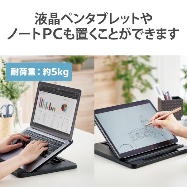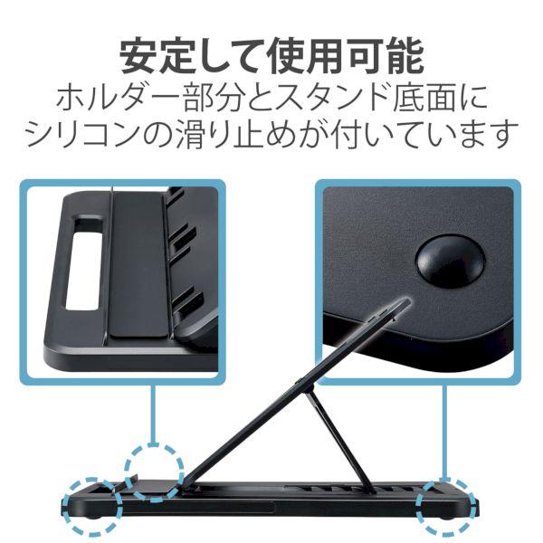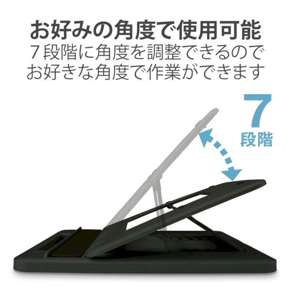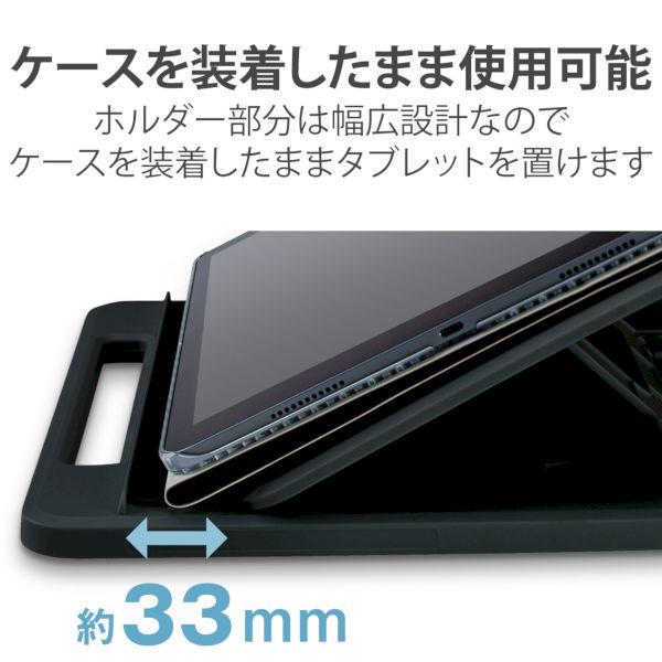 エレコムメーカーお問い合わせ:0120-898-794【商品説明】●ドローイング、タイピングに最適なタブレットスタンドです。●ホルダー部分は約33mmの幅広設計でケースを装着したままタブレットを置くことができます。●タブレットだけでなく、液晶ペンタブレットやノートパソコンも置くことができます。●およそ9.7~12.9インチのタブレット、13.3インチまでの液晶ペンタブレット、ノートパソコンに対応しています。●7段階に角度調節が可能で、お好みの角度で使用できます。●折り畳みが可能で取っ手付きのため、収納や持ち運びに便利です。●ホルダー部分とスタンド底面にシリコンの滑り止めが付いているため、安定して使用できます。