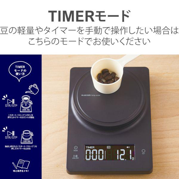 エレコムメーカーお問い合わせ:0120-898-794【商品説明】●豆の量/抽出時間/湯量を正確に計測し、自分好みのコーヒーを探求できるドリップスケール。●タイマーと重量の計測を同時に行うことができ、正確に時間と重量の管理を行うことができます。●タイマー計測は、カウントアップ式で測定範囲は0~9:59です。●TIMERモードとTIMER AUTOモードの二つがあります。●TIMERモードではタイマーを手動操作することができ、0.1g計量で豆の量を正確に測ることができます。●TIMER AUTOモードではタイマーの自動開始/停止機能搭載、1g計量で湯量を正確に調整することができます。●タイマーの自動開始/停止機能では、お湯を注ぎ始めるタイマーが自動で開始し、お湯を注ぎ終えドリッパーを外すと自動でタイマーと重量を停止します。●操作音とタイマー計測時の30秒ごとのカウント音でハンドドリップをサポートします。●音量を調整することができ、OFF/1/2/3から選択することができます。●重量は0~2,000gまでの計量を行うことが可能です。●本製品の最小計量表示は、表示している重量に合わせて自動で変わります。●0~200gの場合±0.1g単位、200~1,000gの場合±0.5g単位、1,000~2,000gの場合±1g単位です。●表示画面が大きく、バックライトがついているので、暗い場所でも見やすいです。●お住まいの地域設定を行い、正確な計量を行うことができます。●計量精度は、0~200gの場合±0.2g、200~1,000gの場合±1g、1,000~2,000gの場合±3gです。●容器に入れて計量物を量る際、容器を乗せ0gセットボタンを押すことで容器の重さを差し引くことができます。●無操作状態で約2分経過すると、自動的に電源がoffになります。