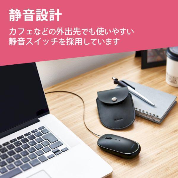 エレコムメーカーお問い合わせ:0120-898-794【商品説明】●持ち運びしやすいサイズ感と操作性を兼ね備えた、ケーブル巻き取りタイプの”Slint モバイルマウス”です。●わずか約28mmの薄型設計のため、かばんやポケットに入れて持ち運んでもかさばりにくく、移動の多いビジネスパーソンやテレワークにおすすめです。●電池交換が不要で、パソコンのUSBポートにケーブルを差すだけですぐに使える有線接続タイプです。●ケーブル巻き取りタイプのため、本体にケーブルを収納することでコンパクトにまとまります。●最大約63cmまで伸びるケーブルは、操作する場所やお好みに合わせて長さの調節が可能です。●コネクターを本体裏面にぴったりと収納できるので、すっきりとまとまり持ち運びにも便利です。●カチカチと音がしない”静音スイッチ”を搭載しています。●クリック音が静かなため、会議中のパソコン操作や、早朝・夜間の作業など、クリック音が気になるシーンでも安心して使用できます。●本革のようなやわらかい質感とクラシックな色味のソフトレザー製の収納ポーチを付属しています。●左右ボタンとホイールボタンが付いたシンプルな3ボタンタイプです。●持ちやすく、ポインターもスムーズに操作しやすいMサイズです。●ケーブルを含めてわずか約53gの軽量設計で持ち運びにも便利です。●小さな凹凸やホコリがある環境でも正確にポインターを動かせる”BlueLEDセンサー”を搭載することで、木材・樹脂・ガラス製のデスクや、ノート、テーブルクロスの上などでも快適に操作できます。●滑りにくく、動きがなめらかなスクロールホイールを搭載しています。●左右対称で、右利き・左利きを問わず使いやすいシンメトリーデザインを採用しています。●自社環境認定基準を1つ以上満たし、『THINK ECOLOGY』マークを表示した製品です。●環境保全に取り組み、製品の包装容器が紙・ダンボール・ポリ袋のみで構成されている製品です。