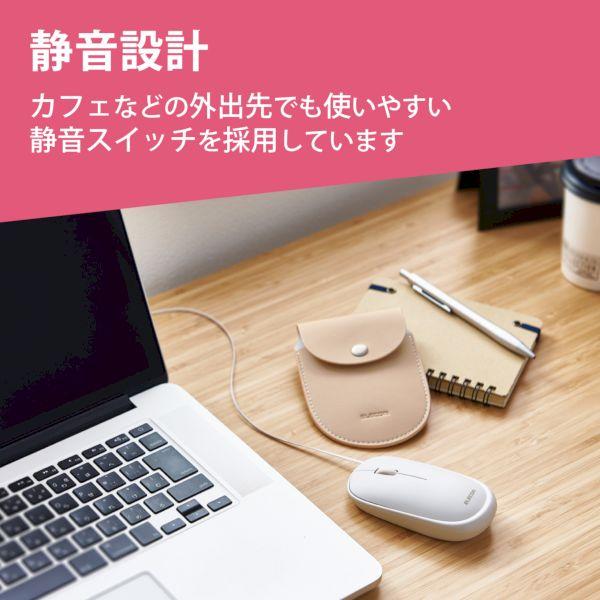 エレコムメーカーお問い合わせ:0120-898-794【商品説明】●持ち運びしやすいサイズ感と操作性を兼ね備えた、ケーブル巻き取りタイプの”Slint モバイルマウス”です。●わずか約28mmの薄型設計のため、かばんやポケットに入れて持ち運んでもかさばりにくく、移動の多いビジネスパーソンやテレワークにおすすめです。●電池交換が不要で、パソコンのUSBポートにケーブルを差すだけですぐに使える有線接続タイプです。●ケーブル巻き取りタイプのため、本体にケーブルを収納することでコンパクトにまとまります。●最大約63cmまで伸びるケーブルは、操作する場所やお好みに合わせて長さの調節が可能です。●コネクターを本体裏面にぴったりと収納できるので、すっきりとまとまり持ち運びにも便利です。●カチカチと音がしない”静音スイッチ”を搭載しています。●クリック音が静かなため、会議中のパソコン操作や、早朝・夜間の作業など、クリック音が気になるシーンでも安心して使用できます。●本革のようなやわらかい質感とクラシックな色味のソフトレザー製の収納ポーチを付属しています。●左右ボタンとホイールボタンが付いたシンプルな3ボタンタイプです。●持ちやすく、ポインターもスムーズに操作しやすいMサイズです。●ケーブルを含めてわずか約53gの軽量設計で持ち運びにも便利です。●小さな凹凸やホコリがある環境でも正確にポインターを動かせる”BlueLEDセンサー”を搭載することで、木材・樹脂・ガラス製のデスクや、ノート、テーブルクロスの上などでも快適に操作できます。●滑りにくく、動きがなめらかなスクロールホイールを搭載しています。●左右対称で、右利き・左利きを問わず使いやすいシンメトリーデザインを採用しています。●自社環境認定基準を1つ以上満たし、『THINK ECOLOGY』マークを表示した製品です。●環境保全に取り組み、製品の包装容器が紙・ダンボール・ポリ袋のみで構成されている製品です。