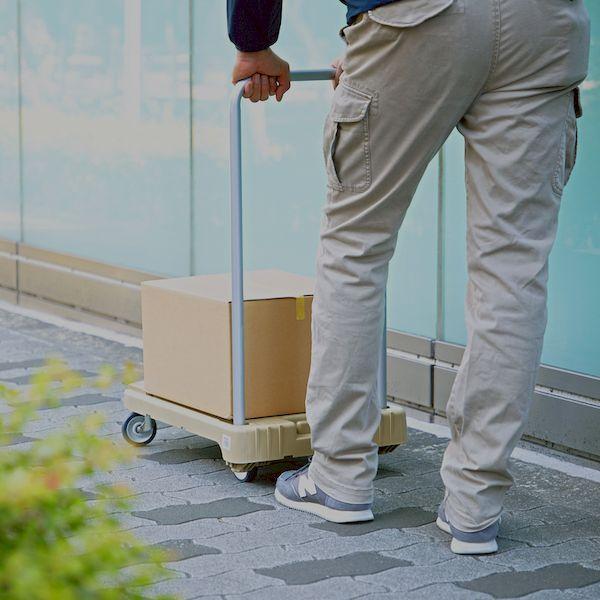 【商品説明】【特長】●φ75省音キャスター採用で音が静かです。●エラストマー樹脂車輪の採用で従来のゴム車輪と比較して反発性が高く軽く動き、タイヤ痕を軽減します。●軽量3.9kg(従来品と比べ約9%軽量化)なので、作業者の負担を軽減し、持ち運び(移動)もしやすいです。●豊富なカラーバリエーションで多様なシーンやニーズに対応します。●ハンドルを本体内に収納でき、省スペースに収納可能です。●ハンドル収納時は平台車として使用可能です。●ワンタッチ機構採用でハンドルのロック・解除が簡単です。●立て置きできます。【用途】●事務所などでの資料の運搬に。●家庭でのごみ出しなどに。【仕様】●均等荷重(kg):100●色:ライトサンド●長さ(mm):600●幅(mm):390●高さ(mm):125●ハンドル高さ(mm):790●キャスター径(mm):75●適合ストッパー:KW-GJS、MP-6039NFB【仕様2】●完成品●自在キャスター、固定キャスター各2個●騒音値:40.75dB●折りたたみハンドルタイプ【材質/仕上】●荷台:再生ポリプロピレン(PP)再生材100%●ハンドル:スチール●ハンドル表面処理:メラミン焼き付け塗装●キャスター金具:スチール【注意】●ハンドルを倒しての使用や持ち運びなどの際は必ずハンドルロックを行ってご使用ください。●転倒防止機能はありません。●転倒にご注意ください。
