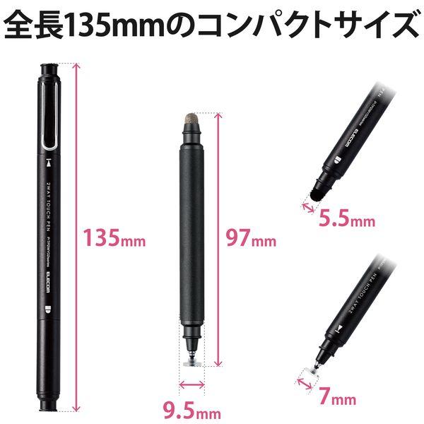 エレコムメーカーお問い合わせ:0120-898-794【商品説明】●高密度ファイバーチップを採用し、思い通りに反応する超感度タイプと、細かい操作がしやすいディスクタイプ。シーンに合わせて選べる2種類のペン先を採用したタッチペンです。●思い通りに反応する超感度タイプと、細かい操作がしやすいディスクタイプの2種類のペン先を用途によって選べる2WAYタイプです。●超感度タイプは、軽い力でスムーズな書き心地を実現する素材を使用しており、ガラスフィルムでも操作が可能です。●※液晶保護フィルムの種類によっては、タッチペンの反応が悪くなる恐れがあります。●ディスクペン型のペン先がクリアで見えやすいため細かな操作が可能です。●※ディスク型ペン先を過度に傾けると、破損する恐れがあります。●胸ポケットなどに入れて持ち運ぶのに便利なクリップが付いています。●ペン先を保護するキャップ2個付きです。●キャップ同士は重ねることができ使用時に無くす心配がありません。●ペン先が劣化した際に別売のペン先(超感度ペン先:P-TIPC02、ディスク型ペン先:P-TIPD02)に交換でき快適な操作感を維持できます。●全長135mmでコンパクトなサイズです。●※本製品を合皮などの樹脂製品に接触させると、色移りする場合があります。●※ペン先以外の部分で画面を操作すると画面に傷が付く恐れがあります。●自社環境認定基準を1つ以上満たし、『THINK ECOLOGY』マークを表示した製品です。●環境保全に取り組み、製品の包装容器において、原料に占める石油系プラスチック代替原料の割合が10%を超えている製品です。