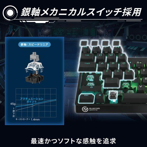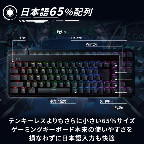 【商品説明】●“ELECOM GAMING V custom”は、プロからエントリーまで、勝ちにこだわるすべてのプレイヤーの皆様と向き合い、数値性能だけでなく、感覚的な使い心地を大切に作り込んだ、一人ひとりにぴったりハマる“勝てるデバイス”をお届けする、エレコムの新しいハイクラス・ゲーミングデバイスシリーズです。●ガンシューティング系ゲーム(FPS)の高速な指の動きにもぴったりハマるサイズ感、キー配列、キー形状を精緻に作り上げた、銀軸搭載の65%サイズゲーミングキーボード、LED搭載モデルです。●キー入力における応答速度(Speed)、精度(Precision)、安定性(Stability)を高めた新開発のゲーミングキーボード用エンジン“ELECOM Wireless S.P.S Engine for Keyboard”を搭載しています。●“ELECOM Wireless S.P.S Engine for Keyboard”は、独自の測定方法による正確な応答速度の計測と、プロゲーマーによる感性評価により、応答速度を当社比で約55%高速化し、さらに、緻密な精度と安定性の向上を行うことで、業界最速クラスの実効応答速度を実現しています。●プロゲーマーを含むプロジェクトチームにて、幾多の試作の末に生み出された“ネオクラッチキーキャップ”は、キーが指にグッと食いつきつつも離れやすいといった、ゲームプレイに最適で操作ミスをしにくいキー形状を実現しています。●WASDをホームポジションとして、その周辺キーを縦横高速に往復するゲーム特有の指の動きを邪魔しないよう、一つひとつのキーの相対高さや角度を最適化しています。●ゲームプレイ中の各指のキーストローク角度を研究し尽くし、高速で打ち込んでも指がずれないようキートップをラウンドさせ、Z~Mキーは左手親指での操作に最適化した特殊なアシンメトリー形状を採用しています。●キーの印字は、色の異なるプラスチック材料で文字を成形する“ダブルインジェクションPBTキーキャップ”を採用し、キー印字の塗装が剥がれにくい、圧倒的な耐摩耗性を実現しています。●デスク上でマウスの操作スペースを最大限に確保できる65%サイズの独自日本語配列を採用しています。●コンパクト配列のキーボードでは省略されやすいESCキーなどのゲーム中の操作頻度が高いキーや、スクリーンショット撮影のPrintScreenキー、観戦中に便利なPageUpキー、PageDownキーを搭載しています。●テキスト入力とゲームプレイのしやすさを両立させるため、プレイヤー同士のチャットなど、日本語入力もスムーズに行えるよう、半角全角キーや方向キー、Deleteキーを搭載し、スペースキーを広くとった日本語環境のプレイヤーに最適な配列です。●専用設定ソフトウェア“EG Tool”を使用すると、全キーの機能をカスタマイズできます。●変換、無変換、かな、メニュー、Gaming、EJキーの6つの純正キーキャップを同梱しているため、キーを取り換えることで各プレイヤーの入力スタイルへの最適化も可能です。●※キーへの機能割当を変更する場合は、専用設定ソフトウェアでの設定が必要です。●本体上面には、ワイヤレスゲーミングマウスと本品をあわせて使用する際に便利な、“追加USBポート”を搭載しています。●“追加USBポート”によって、ワイヤレスマウスの近くにマウス用レシーバーを配置できるため、パソコン本体に配置するよりも電波が届きやすく、快適なゲーミング環境を実現します。●“追加USBポート”は、1000Hzの1ポーリング(1ミリ秒)にも満たない、わずか約200マイクロ秒という極限の遅延軽減を施したUSBハブ方式を採用しています。●また、ワイヤレス接続の際に電波障害の原因となる、パソコンなどからのノイズをブロックするEMI対策を行っています。●ケーブルは、取り回しがしやすい驚きの柔軟性を持った“着脱式USB Type-C(TM)パラコードケーブル”を採用しています。●ケーブルのコネクターは、ゲームを行う場所の移動時やデスク周りの掃除に便利で、万が一の断線時にも簡単に交換できるUSB Type-C(TM)着脱式を採用しています。●スピーディーな押下とソフトな感触を追求した銀軸(スピードリニア)を搭載しています。●技術者の知見とプロゲーマーの鋭い感性から打鍵感、品質、コストのバランスに優れたパーツを選定し、実用性に優れた最適なコストパフォーマンスを実現しています。●キートップに、視認性に優れたステンシル調のフォントを印字しています。●全てのキーに、ゲーム環境を彩る 1677万色RGBライティングを搭載しています。●専用設定アプリのEG Toolを使用することで、光り方のパターン、速度、色などを好みに合わせてカスタマイズすることが可能です。●すべてのキーが同時入力が可能な“Nキーロールオーバー”に対応しています。●複雑なキーの同時押下が必要なゲームでも、操作を取りこぼすことなく正確に入力できます。●専用設定ソフトウェア“EG Tool”を使用すると、すべてのキーに割り当てる機能の変更が可能で、好みに合わせて最適なカスタマイズが可能です。●キーボード本体に、キーの機能割