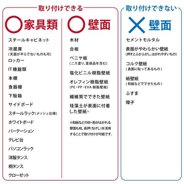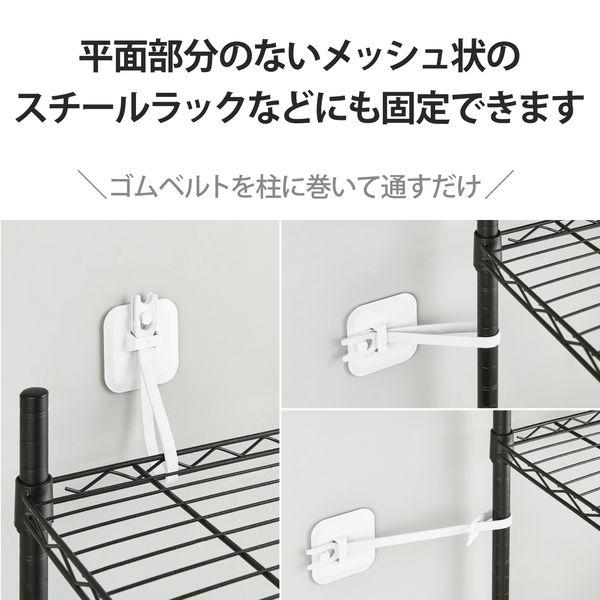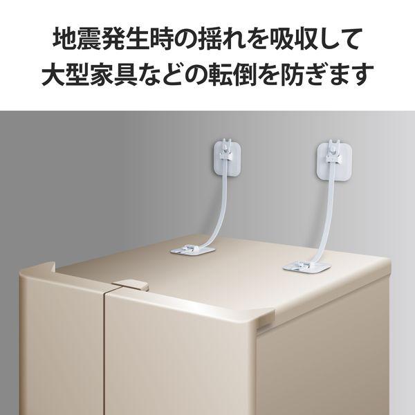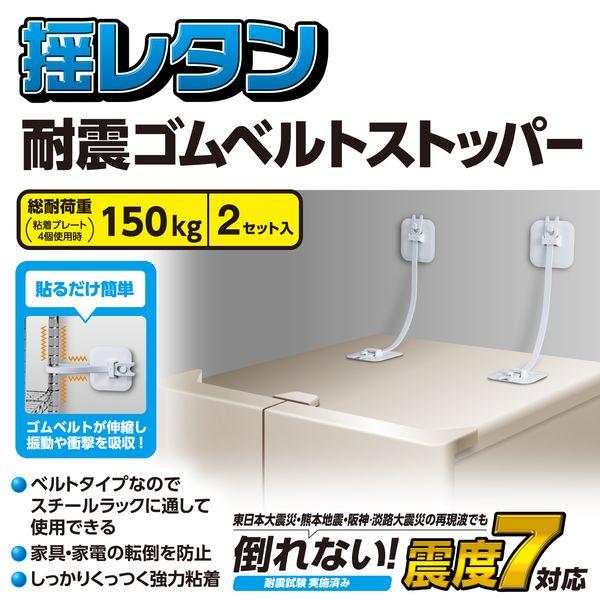 【商品説明】●冷蔵庫や食器棚などの大型家具に取り付けることで、地震発生時の揺れを吸収して転倒を防ぐ耐震ゴムベルトです。●東日本大震災・熊本地震・阪神淡路大震災の再現波でも倒れない、震度7相当の振動試験をクリアしています。●※本製品は揺れによる転倒を最小限に抑えるためのもので、地震などによる破損や事故に対しての責任を負うものではありません。●強力粘着シールによって、さまざまな家具や壁面にプレートを取り付けて固定できます。●※粘着を安定させるため、設置後72時間は動かさないようにしてください。●※粘着シールは貼付け後、剥がすと粘着効果が落ちますのでご注意ください。●ゴムベルトを柱に巻いて通すことで、平面部分のないメッシュ状のスチールラックなどにも固定可能です。●安心の日本製です。