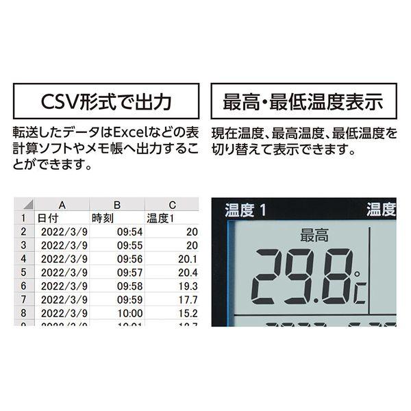 【商品説明】●特徴●2箇所同時に測定した約63,000件のデータを製品本体に記録し、パソコン上でログデータ※を確認できます。※CSV形式で出力されます。パソコンにインストールされている表計算ソフトやメモ帳などで数値を確認してください。●現在温度と最高・最低温度の表示を切り替えできます。●温度センサーは地面に差し込んで使えるプローブ型のため、地温や水温などのログを取ることができます(本体には温度センサー非搭載)。●防塵・防水性能 本体はIP54、温度センサー部はIPX7です。●データ転送用ソフトのダウンロードについて パソコンへデータを転送するためには専用のソフト※が必要です。シンワ測定ホームページ「ソフトダウンロード」ボタンよりダウンロードしてからご使用ください。製品本体のみではログデータを確認することはできません。●仕様、規格●測定範囲 -50~90℃●精度 0~40℃:±0.5℃ -20~0℃、40~50℃:±1.5℃ それ以外:±2.0℃●最小表示 0.1℃●使用温度 本体:-5~50℃ 温度センサー:-50~90℃●測定間隔 約20秒●データ保存先 本体内蔵メモリ●データ記録間隔 1、5、10、30、60分●データ保存件数 約63,000件(年、月、日、時、温度1、温度2を1件とする)●プローブサイズ 温度センサー部:φ5×50mm コード長:3m●電源 単3アルカリ乾電池 2本、USB給電 5V/1A(付属の電池はモニター用の為、寿命が短い場合があります。)●電池寿命 約300日(20℃環境において、1分間隔で記録した場合)●防塵・防水性能 本体:IP54(USBケーブル接続時は防塵・防水性能が保証されません)※ 温度センサー部:IPX7※防塵性能:粉塵が内部に侵入することを防止します。若干の粉塵の侵入があっても正常な運転を阻害しません。 防水性能:いかなる方向からの水の飛沫によっても有害な影響を受けません。●材質 本体:ABS樹脂、シリコンゴム 液晶:ガラス 液晶カバー:アクリル樹脂 温度センサー:塩化ビニル樹脂、ステンレス●本体サイズ 127×110×31mm●製品質量 280g(電池含)●付属品 USB(Type-A - micro Type-B)ケーブル