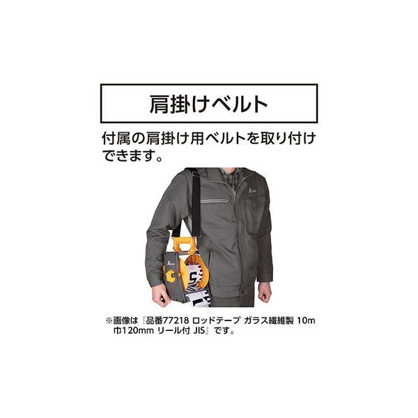 【商品説明】●特長●ロッドテープ●固定に便利な金具付です。●先端まで両サイド目盛が付いています。●引っ張り試験で実証済みの伸びにくい材質です。●摩耗しても目盛が消えません。耐摩耗試験で実証済みです。●写真写りが良く、読み取りやすい目盛数字を採用しています。●ロッドテープリール●ロッドテープが収納でき、持ち運びに便利です。●スムーズにテープが巻き取れます。●テープ接続部はワンタッチで着脱できて便利です。●付属の肩掛け用ベルトを取り付けできます。●仕様●ロッドテープ●目盛 表面:タテ数字、両サイド目盛、20cm赤白、1cm単位 裏面:ヨコ数字、片サイド目盛、1m赤白、1cm単位●標準張力 50N●材質 テープ:ガラス繊維、塩化ビニル樹脂 金具:鉄●長さの許容差 ±(1.2+0.8L)mm 端面を基点とする場合 ±{(1.2+0.8L)+0.4}mm Lは測定長をメートルで表した数値●テープ厚さ 0.65mm●製品質量 2,565g●ロッドテープリール●材質 ハンドル、板面:ABS樹脂 軸棒:アルミ ベルト:ナイロン、鉄●本体サイズ 284×174×183mm(ハンドルを畳んだ状態)●製品質量 1,200g(ロッドテープ収納時:3,765g)