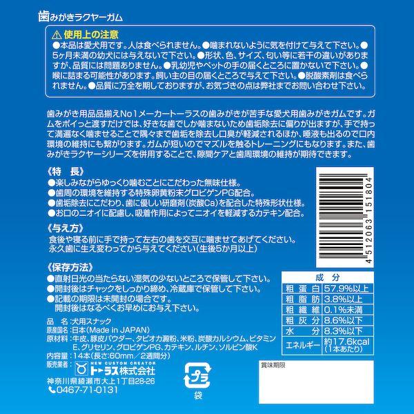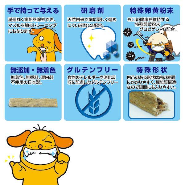 【商品説明】●楽しみながらゆっくり噛むことにこだわった無味仕様。●歯周の環境を維持する特殊卵黄粉末グロビゲンPG配合。●歯垢除去にこだわり、歯に優しい研磨剤(炭酸Ca)を配合した特殊形状仕様。●お口のニオイに配慮し、吸着作用によってニオイを軽減するカテキン配合。●原材料:牛皮、豚皮パウダー、タピオカ澱粉、米粉、炭酸カルシウム、ビタミンE、グリセリン、グロビゲンPG、カテキン、ルチン、ソルビン酸K●保証成分:粗たん白質57.9%以上、粗脂肪3.8%以上、粗繊維0.1%未満、粗灰分8.6%以下、水分8.3%以下ペット 犬 歯 はみがき ハミガキ 歯みがき 歯磨 歯磨き デンタル おやつ 間食 ガム グルテンフリー