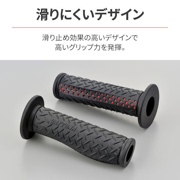 【商品説明】滑らないから疲れにくい、デイトナオリジナルグリップ。手の平の下側にあたる部分を広げることで、スロットル操作時の手首の動きを少なくし疲れを軽減。高速クルージングが快適になります。●φ22.2mmハンドル用グリップ●グリップ長:122mm●グリップ面積を広げ快適な高速クルージング●エンド貫通タイプ※ 確実に取り付けるため、グリップボンドを使用してください。セーフティワイヤーを併用すると、より効果的です。※ 純正スロットルスリーブがリブ付構造の車両はリブを削ってください。