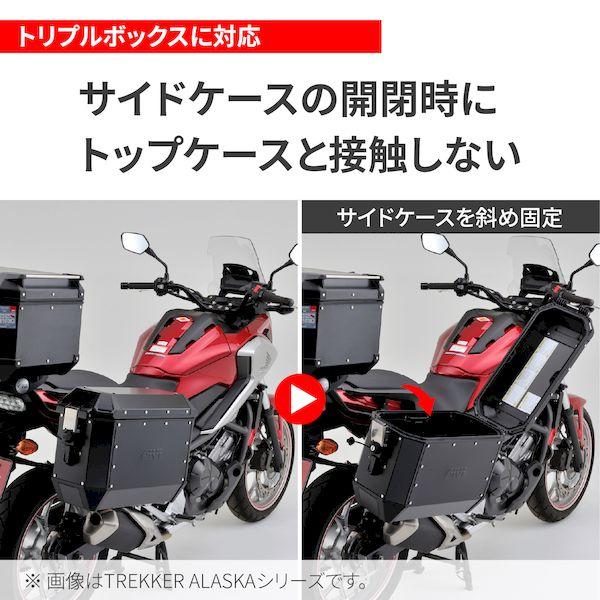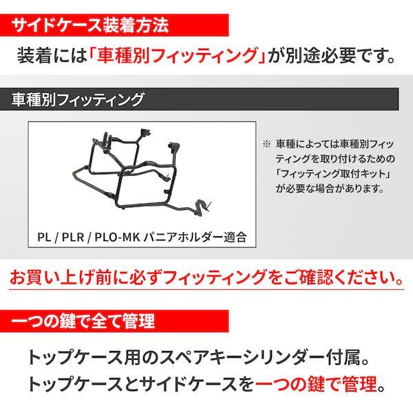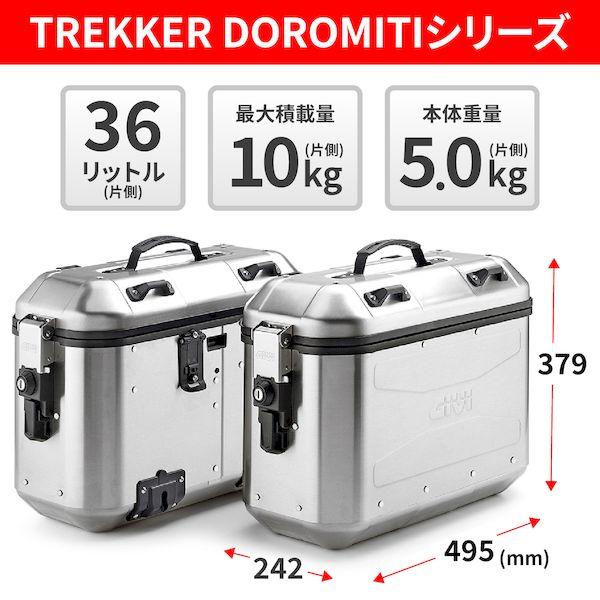 【商品説明】アルミのサイドケース TREKKER DOROMITIシリーズ。サイドケースの斜め固定が可能な「HOLD IT EASYシステム」を採用。ワンタッチでサイドケース取り外し可能な「WIRELEASEシステム」を採用。2つのシステムにより、ワンタッチでサイドケースの斜め固定が可能。サイドケースの開閉時にトップケースと接触して開かない状態を防ぎます。1つの鍵で左右ボックスの開閉に対応します。付属しているスペアキーシリンダーをトップケースに取り付けることで、1つの鍵でトップケースとサイドケースの開閉も可能。●バイク用 サイドケース / 片側容量:36L、最大積載重量:10kg●サイドケースの開閉時にトップケースと接触しないように、斜め固定が可能なHOLD IT EASYシステム●ワンタッチでサイドケース取り外し可能なWIRELEASEシステム●サイズ(外寸):奥行242×幅495×高さ379mm、片側重量:5.0kg●適合する車種別フィッティング:PL / PLR / PLO-MK パニアホルダー※ 防水性を考慮した設計をしておりますが、完全防水ではありません。※ 素材独自の風合いを出すために、アルミ部分に表面処理を行なっておりません。手あかや水あかなどの汚れが定着しやすい傾向にあります。※ この商品は金属製のケースにつき、樹脂製のケースよりも内容物の傷つきには特にご留意ください。※ 車種別フィッティングの形状/条件によっては、PL/PLRパニアホルダーへの取り付けができない場合があります。※ PL/PLRパニアホルダーへの取付には付属カラーの取付が必要です。※ トップケース用スペアキーシリンダー付属。