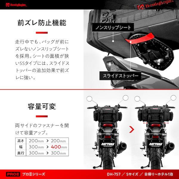【商品説明】固定も、機能も、収納もすべてがPRO。「ブレーキングや段差を乗り越えた時、バッグが前にズレてくる」「スーパースポーツに大きなシートバッグを付けたいのだけど」そんなお客様の声に真剣に取り組んで生まれたのが、シートバッグPROシリーズ。走行中でもバッグが前後左右にズレないノンスリップシートを採用。シートの面積が狭いSSタイプには、スライドストッパーの追加効果で前ズレに強い。車両に合わせた固定が可能になったPRO2シリーズ。手軽なイージーリングベルト、しっかり固定できる4点支持ベルトの2つの方法を用意。バッグの形をキープする連結ベルトや機能性をアップしたフラップなどPRO2ならではの機能を搭載。【仕様1】日帰りから1泊のツーリングに最適な可変型バッグ【仕様2】選べる2つの固定方法 イージーリングベルト / 4点支持ベルト【仕様3】バッグの前ズレや荷崩れ防止、乗降時の妨げになりにくい形状などアイデア満載のPRO仕様【仕様4】容量:20-26L / サイズ:高さ200×幅300-400×奥行300(mm) / 総重量:2.1kg / 最大積載量:8kg【商品構成】本体、イージーリングベルト(N25B)、ショルダーベルト、レインカバー※ PRO2はイージーリングベルトN25B(品番:26216)での安定した固定ができるよう、バッグ本体も専用設計となっております。PRO2以外のPRO・WR・BASIC・SYSTEMは安定した固定ができない場合があるためイージーリングベルトN25B(品番:26216)は適合不可となります。