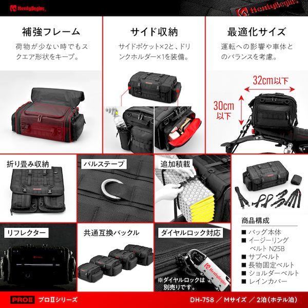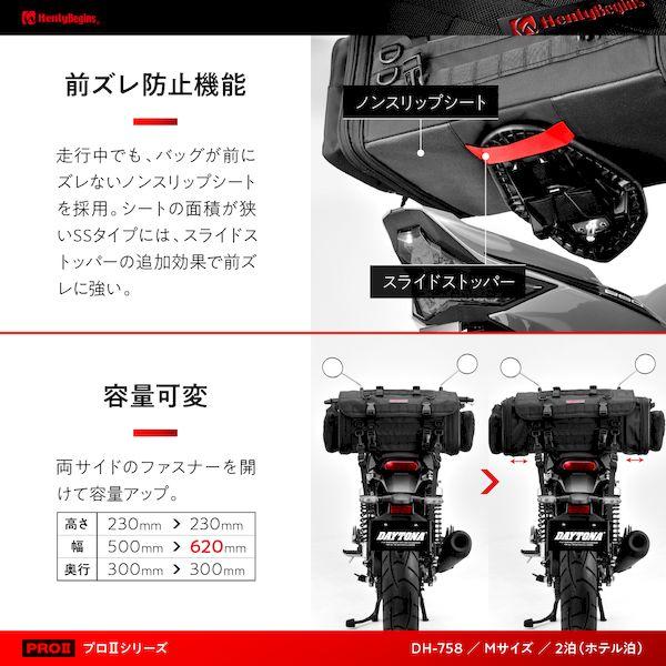 【商品説明】固定も、機能も、収納もすべてがPRO。「ブレーキングや段差を乗り越えた時、バッグが前にズレてくる」「スーパースポーツに大きなシートバッグを付けたいのだけど」そんなお客様の声に真剣に取り組んで生まれたのが、シートバッグPROシリーズ。走行中でもバッグが前後左右にズレないノンスリップシートを採用。シートの面積が狭いSSタイプには、スライドストッパーの追加効果で前ズレに強い。車両に合わせた固定が可能になったPRO2シリーズ。手軽なイージーリングベルト、しっかり固定できる4点支持ベルトの2つの方法を用意。バッグの形をキープする連結ベルトや機能性をアップしたフラップなどPRO2ならではの機能を搭載。【仕様1】2泊のツーリングに最適な可変型バッグ【仕様2】選べる2つの固定方法 イージーリングベルト / 4点支持ベルト【仕様3】バッグの前ズレや荷崩れ防止、乗降時の妨げになりにくい形状、非使用時のコンパクト性などアイデア満載のPRO仕様【仕様4】容量:37-44L / サイズ:高さ230×幅500-620×奥行300(mm) / 総重量:3.5kg / 最大積載量:10kg【商品構成】本体、イージーリングベルト(N25B)、サブベルト、長物固定ベルト、ショルダーベルト、レインカバー※ PRO2はイージーリングベルトN25B(品番:26216)での安定した固定ができるよう、バッグ本体も専用設計となっております。PRO2以外のPRO・WR・BASIC・SYSTEMは安定した固定ができない場合があるためイージーリングベルトN25B(品番:26216)は適合不可となります。