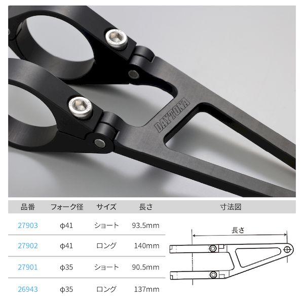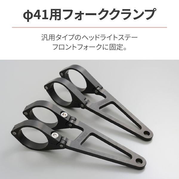 【商品説明】アルミ削り出しのヘッドライトブラケット。ヒンジ式でトップブリッジを取り外すことなく取り付けが可能。また、ヘッドライト幅はフレキシブルに対応可能。●汎用ヘッドライトステー●フロントフォークφ41mm用●ヒンジ式で取付簡単●アルミ製マットブラックアルマイト処理