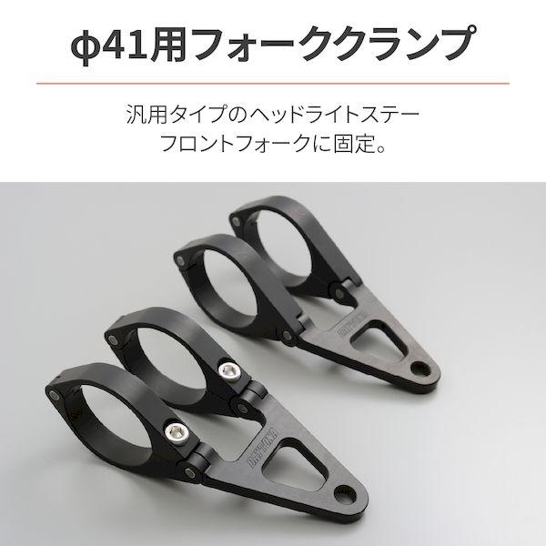 【商品説明】アルミ削り出しのヘッドライトブラケット。ヒンジ式でトップブリッジを取り外すことなく取り付けが可能。また、ヘッドライト幅はフレキシブルに対応可能。●汎用ヘッドライトステー●フロントフォークφ41mm用●ヒンジ式で取付簡単●アルミ製マットブラックアルマイト処理