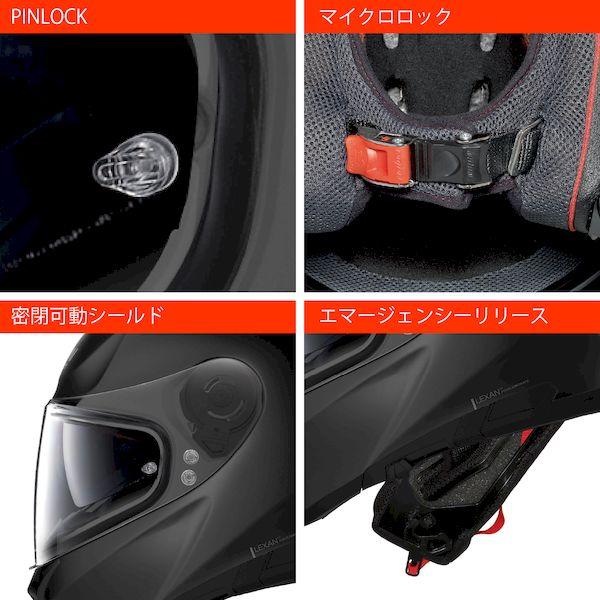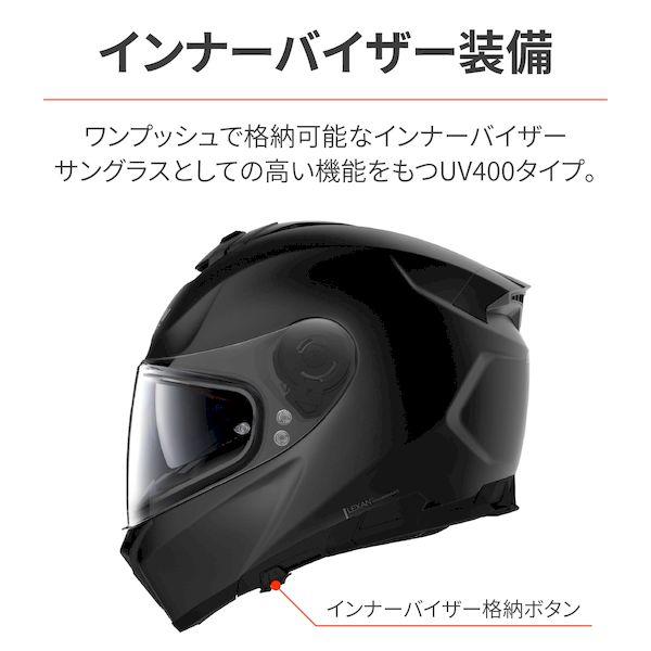 【商品説明】通勤・通学からツーリングユースに最適なバイク用フルフェイスヘルメット。最上グレードモデルと同じ機能を装備することで、街乗りからロングツーリングまで幅広く対応しています。安全基準は欧州のCE規格と日本のSG規格の両方をクリアしています。機動隊の防弾盾にも使用されているLEXAN(ポリカーボネート)を素材に採用することで、軽さと耐衝撃性を両立しました。UV400インナーバイザー(紫外線カット機能)は、ワンプッシュで収納可能になっています。PINLOCKシート(曇らないシールド)など、ツーリング時の必須アイテムを標準装備しています。【用途】通勤・通学からツーリングユースに最適なバイク用フルフェイスヘルメット【仕様1】安全基準は欧州CE規格と日本SG規格の両方クリア【仕様2】機動隊の防弾盾にも使用されているLEXAN(ポリカーボネート)を素材に採用することで、軽さと耐衝撃性を両立【仕様3】ワンプッシュ収納可能なインナーバイザー【仕様4】PINLOCKシート(曇らないシールド)標準装備※ イタリア本国仕様と異なり、N-COMは使用できません。(スピーカー用の約40mmはあります)