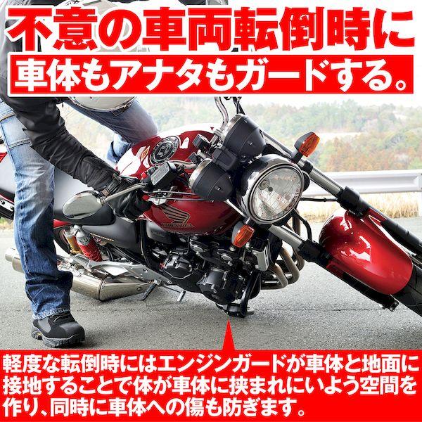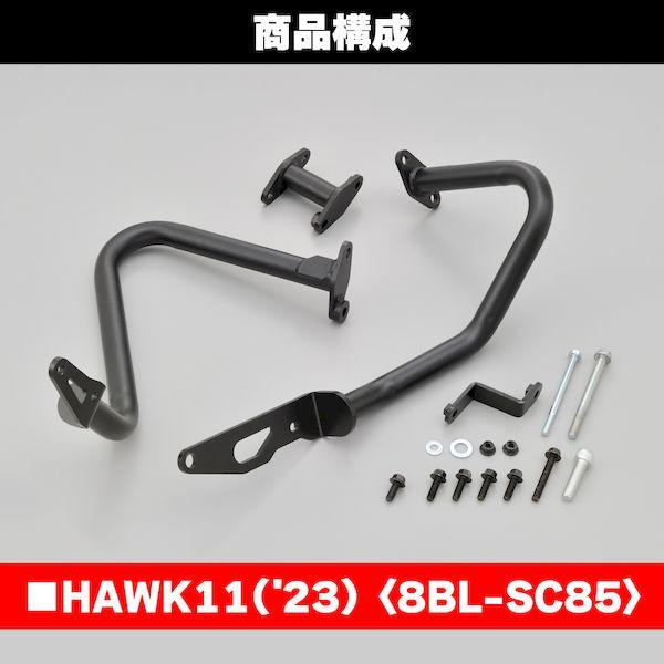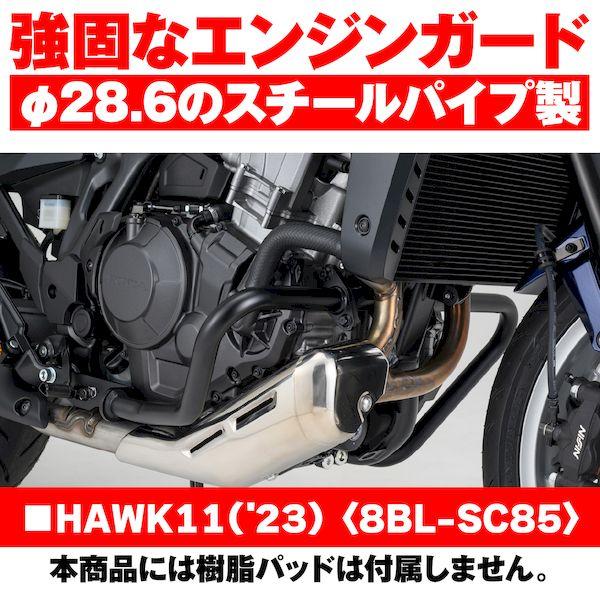 【商品説明】大きく張り出さず目立ちにくいエンジンガード。マットブラックのシンプルなパイプレイアウトにより、車両のイメージを損なわない。メインパイプはφ28.6を採用し、転倒時の車両ダメージを軽減。入念な設計検討により、車体保護と深いバンク角確保をバランス良く両立。取付時間短縮を考慮したセパレート構造(右側)によりマフラーを取り外すことなく、エンジンガード取付が可能。●対応車種:HAWK11(22)●軽度な転倒時にクランクケース回りを保護し、エンジンへのダメージを最小限に●大きく外側へ張り出さない仕様で、装着してもスタイリッシュで目立ちにくいデザイン●車体保護と深いバンク角確保をバランス良く両立●車体フレームに合わせたマットブラック塗装HAWK11(22) [8BL-SC85]※ パイプ径がφ28.6のため、リダクションスライダー(品番:96388)は使用できません。