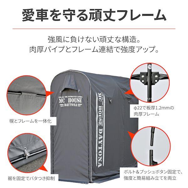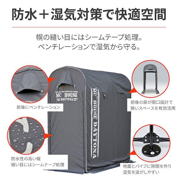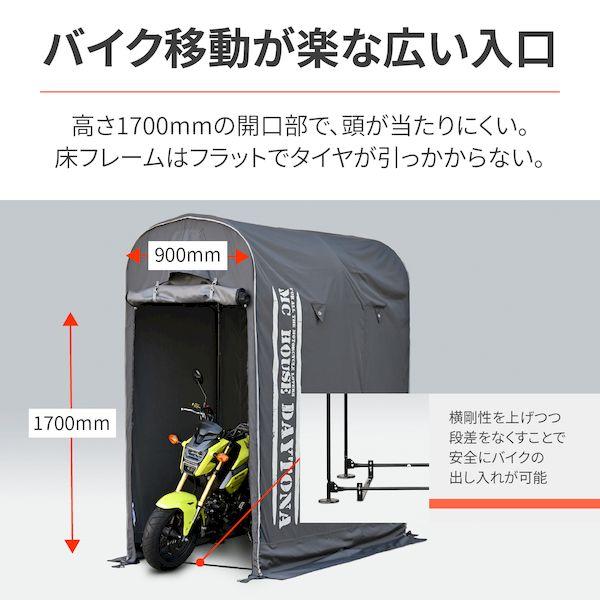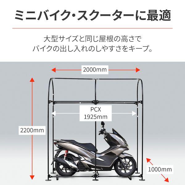 【商品説明】バイクカバーを掛けるのは手間だけどガレージには手が出ない。そんなユーザーの為のバイク保管用テント。【ミニバイクやスクーターの保管に最適】奥行2000mmで125ccとしては大きいPCXも収納可能なサイズ。前後とも扉が開口する設計なので、住宅街のせまいスペースも有効活用できるモデルです。【頑丈なバイクガレージ】φ22mmの板厚1.2mmパイプを採用。金属フレームをボルトで連結することで強度を確保。フレームの連結はボルト固定とプッシュボタン固定を組み合わせることで、強度と組み立ての簡易性を両立。連結部の穴を利用して筋交による補強が可能。室内部4カ所でフレームと幌を固定。面ファスナーで固定することで幌のバタつきを抑えます。幌の外側には風飛び防止用ロープの固定リングを装備。【雨から守る防水性】幌は防水性の高い生地を採用。縫い目にはシームテープ処理を施し、雨の侵入を防ぎます。【湿気対策】前後にエアベンチレーションをつけることで快適にガレージ内をキープ。地面からパイプを持ち上げたフレーム構造で湿気を逃しやすくしています。スカート形状の裾は砂やほこりなどの侵入を防ぎます。【出入りしやすい入口】開口部と屋根の高さは大型サイズと同じ約1700mmでストレスなくバイクが収納できます。開口部はロールアップして固定が可能。開口部ファスナーは全開時にファスナーフォルダーで隠せます。出入口の地面には段差のないフレームステムを装備。段差による転倒を防ぎ、横剛性も向上。開口部分にホールを用意。南京錠での施錠と、市販のポールを固定すればタープとして利用できます。【寸法】開口部:高さ1700mm、幅900mm外寸:高さ2200mm、奥行2000mm、幅1000mm●ミニバイクやスクーターの保管に最適なサイズ。前後とも扉が開口することで、せまいスペースでも設置可能●φ22mm、板厚1.2mmの肉厚パイプを採用。フレームの連結はボルト固定とプッシュボタン固定を組み合わせることで、強度と組み立ての簡易性を両立●前後にエアベンチレーションをつけることで湿気を対策。幌はシームテープ処理を施した防水性の高い生地を採用●間口部の高さは約1700mmでストレスなくバイクを収納 (開口部:高さ1700mm、幅900mm)●外寸:高さ2200mm、奥行2000mm、幅1000mm※ 本商品の組み立て作業は安全確保のために2人以上で行ってください。※ 組み立て作業は周囲の安全を確保し、水平で滑りにくく広くて安全な場所で行なってください。※ 風速約20m以上の強風時は幌を外してください。風の影響を受けてテントが破損や吹き飛ぶなどの事故を起こし物的損 害や人的損害が生じる恐れがあります。※ 積雪時は屋根に積もる雪は定期的に落としてください。過度な積雪がある と雪の重量でテントが破損する恐れがあります。※ 本商品は雨や風、紫外線などで経年劣化します。定期的に各部の異常がないか必ず点検してください。※ 汚れなどを洗浄する場合は柔らかい布やスポンジを使い、水や中性洗剤で軽く洗い流してください。※ 本商品の設置の際は別売りのペグなどを使い地面へ確実に固定してください。また、設置場所の状況(コンクリート地面等)によっては別売りのペグが使えない場合がございます。その場合はアンカーボルトなど別途固定器具を用意するなどし固定してください。※ 本商品は完全防水ではありません。また、テント内と外気に気温差がある場合、結露が発生します。