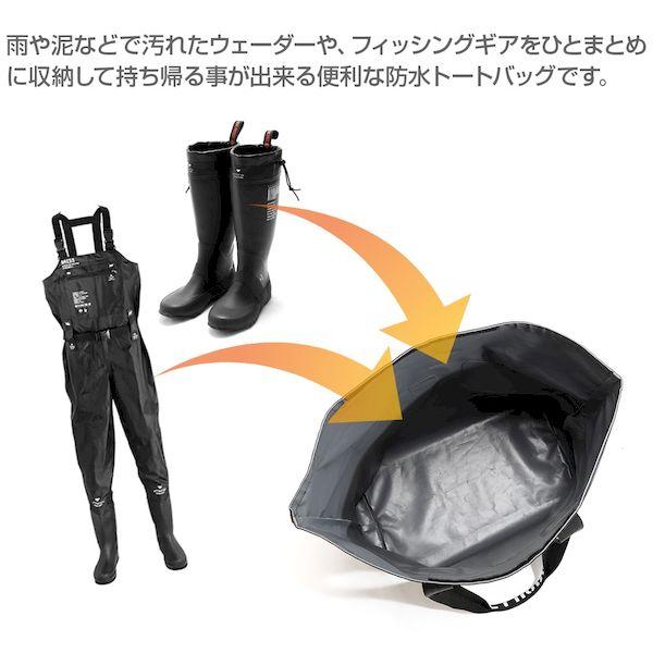 【商品説明】●65Lの大容量であらゆる物を収納可能です。●雨などの水の浸入を防ぐ縫い目のない溶着加工仕様!●お手入れも簡単!水で洗って自然乾燥するだけです。●雨や泥などで汚れたウェーダーやフローティングゲームベスト、フィッシングギアをひとまとめに収納して持ち帰る事が出来る便利な防水トートバッグです。●水漏れなどで車を汚す心配もなく安心して家へ持ち帰ることが出来ます。●丈夫な防水素材でできているので表面についた汚れにも強く、ふき取りなどで簡単にメンテナンス出来ます。●弊社製ウェーダーシリーズ、フローティン