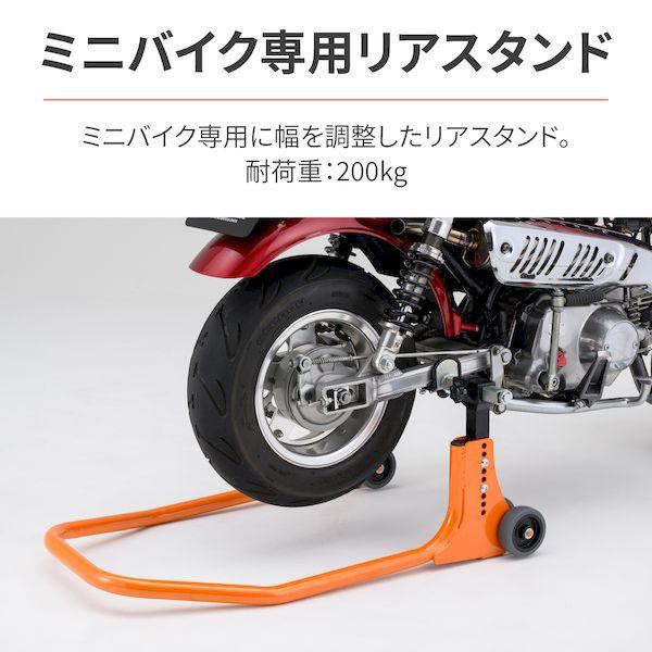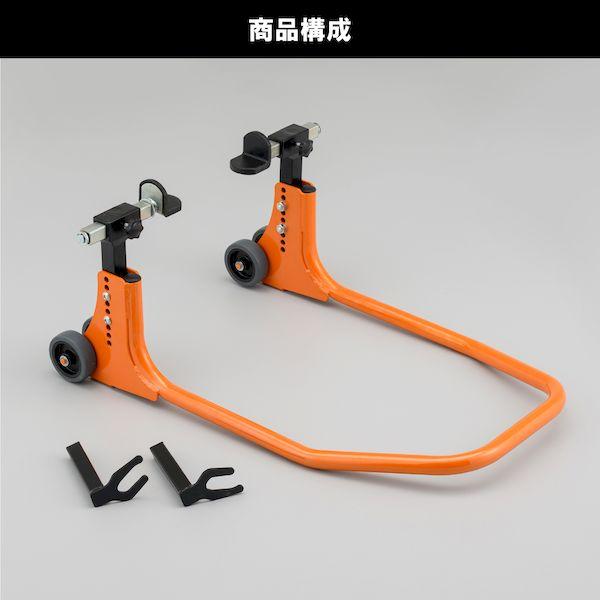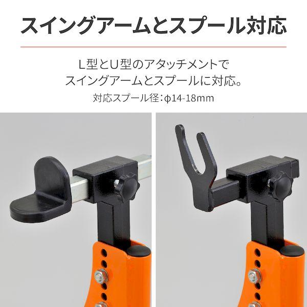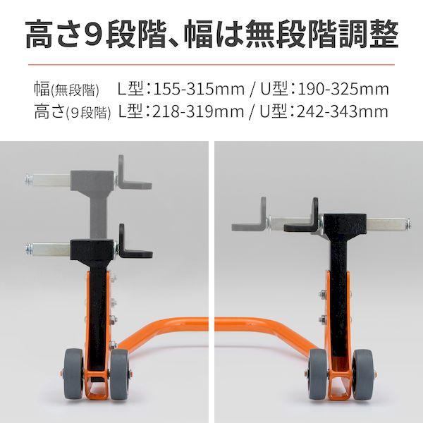 【商品説明】チェーン調整、リアタイヤを取り外す作業などリア周りのメンテナンスには欠かせないリアスタンド。ミニバイクなどスイングアーム幅のせまい車両に最適化しました。新形状フレームと鋳造アームの採用により安心の剛性感。リフトアップ時にはローラーが浮いてフレームが接地する構造にすることで、作業時の安定感が向上。L型とU型アタッチメントを標準装備し、アタッチメント幅は無段階、高さは9段階の調節が可能です。車両に合わせて適切な高さでリフトアップできます。・幅(無段階)L型:155-315mm / U型:190-325mm・高さ(9段階)L型:218-319mm / U型:242-343mm●スイングアームとスプールに対応したミニバイク用リアスタンド●高さ9段階と幅の無段階調整により幅広い車種に対応●作業時に安定するように、リフトアップ時にはローラーが浮いてフレームが接地●対応スプール径:φ14-18mm●耐荷重:200kg※ 左右で段違い等のスイングアームには使用できません。※ U型アタッチメントを使用する際は別途スイングアームスプールを購入する必要があります。
