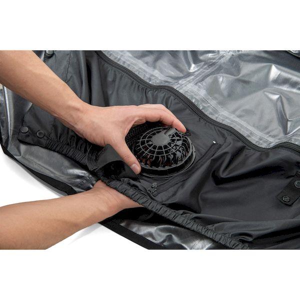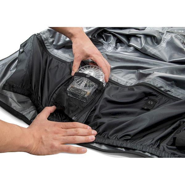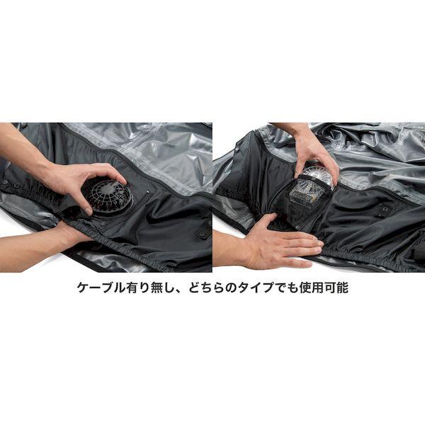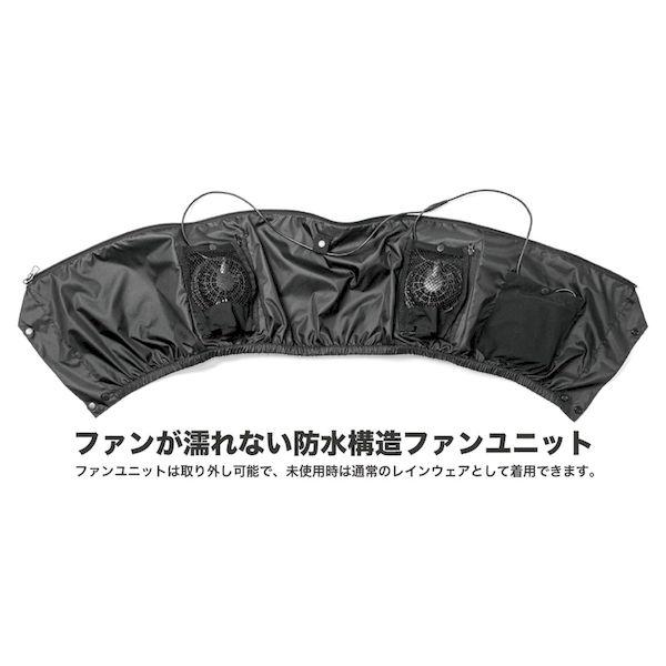 【商品説明】●オールシーズン使えるストレッチレインスーツ。●取り外しができるファンユニット付き。●レインウェアとしても充実の実用機能。●ロールアップ2WAYフード/フード未使用時は丸めてコードで固定しスタンドカラーに。●フーディーバッグ/ウェア上下を折り畳み裏返したフードに収納。襟裏コードをフードのつば裏ループに通しボタンで固定。●背面肩部反射糸/背面肩部に反射糸を採用。夜間の視認性を高めます。●長靴対応ブーツカバー:長靴内部への水や泥の侵入を防止する二重構造。パンツの裾汚れも防ぎます。●胸部にポケット、袖口に調節テープ付き。●耐水圧:10,000mmH2O●サイズ:L●カラー:ブラック×ブラック●耐水圧:10,000mmH2O