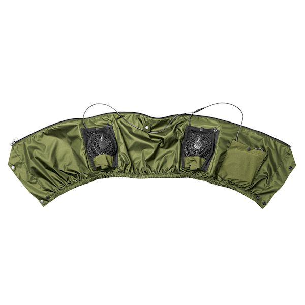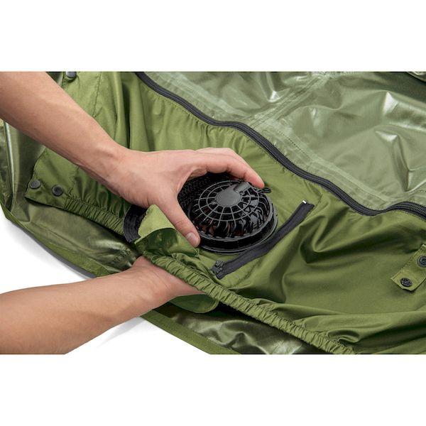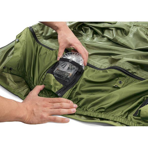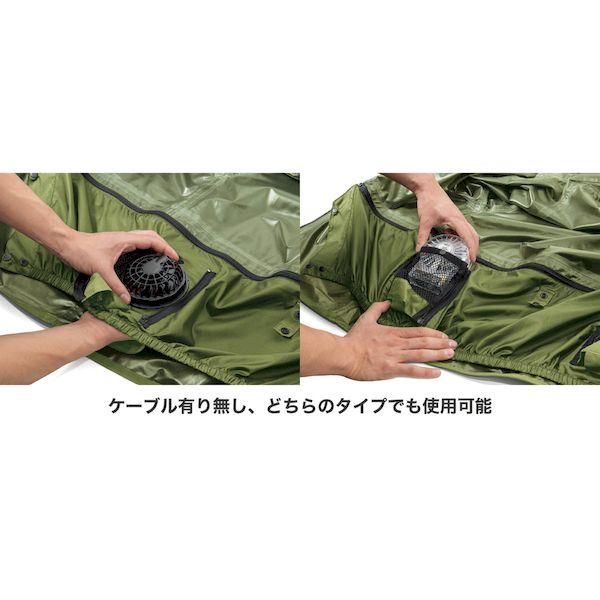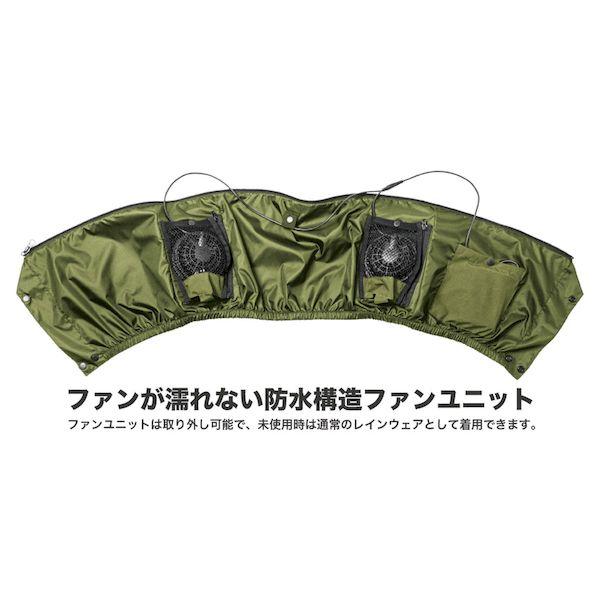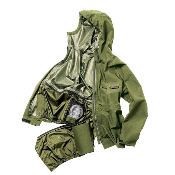 【商品説明】●オールシーズン使えるストレッチレインスーツ。●取り外しができるファンユニット付き。●レインウェアとしても充実の実用機能。●ロールアップ2WAYフード/フード未使用時は丸めてコードで固定しスタンドカラーに。●フーディーバッグ/ウェア上下を折り畳み裏返したフードに収納。襟裏コードをフードのつば裏ループに通しボタンで固定。●背面肩部反射糸/背面肩部に反射糸を採用。夜間の視認性を高めます。●長靴対応ブーツカバー:長靴内部への水や泥の侵入を防止する二重構造。パンツの裾汚れも防ぎます。●胸部にポケット、袖口に調節テープ付き。●耐水圧:10,000mmH2O●サイズ:M●カラー:カーキ×ブラック●耐水圧:10,000mmH2O