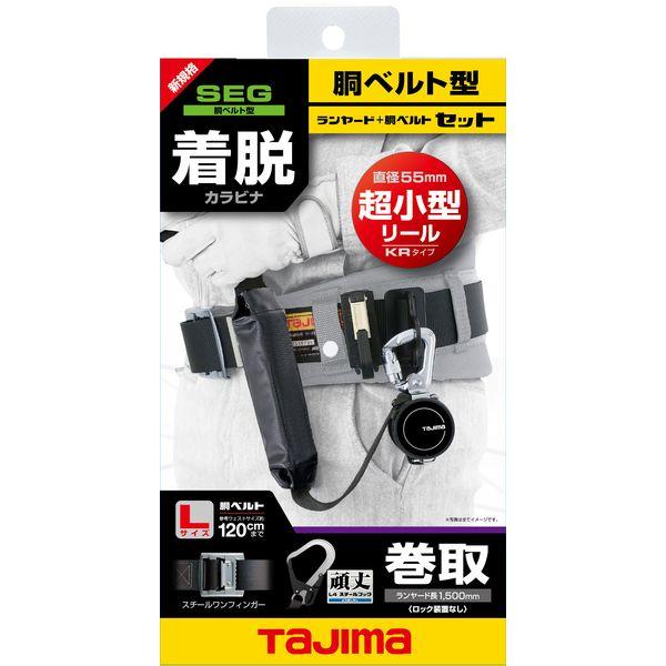 【商品説明】●特徴●取り外しが簡単なアルミ製着脱カラビナ●超小型リール。巻取、ロック装置なし●着脱スペース幅4cm。腰周りのスペースを取りません●2種類の巻取機構を選択できるフリー/オートストップ切替機構●軽量スチールフックL4フック●胴ベルトは革手袋でも操作が簡単なスチールワンフィンガーバックル●仕様、規格●ベルト:Lサイズ●製品重量:1,030g●種類:胴ベルト型●ロック装置:なし●ショックアブソーバ種別:第一種(4kN)●使用可能質量:100kg 以下●ランヤード長:1.5m(収納時約0.47m)●製品重量:620g(ランヤードのみ)●最大自由落下距離:1.8m●落下距離:3.1m●タジマ胴ベルト型ランヤードとの併用が可能です。※小径A環2丁掛け用を使用●付属品 L型D環止め(樹脂2穴) / 小径A環2丁掛け用(SABK) / 後付フックハンガー