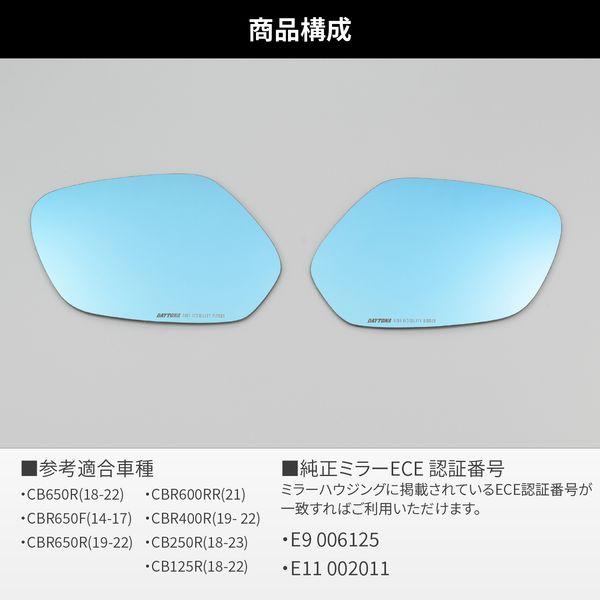 【商品説明】貼るだけで視界が広く、見やすいハイビジミラー。純正よりも視界が広がる曲率R1000の広角ミラーで後方の死角を減らします。防眩効果のあるブルーミラーを採用し、ヘッドライトによる眩しさを軽減。純正ミラーに貼り付けるだけなので、ノーマルのスタイルを崩さずに視界を確保します。【参考適合車種】CB650R(18-22)CBR650F(14-17)CBR650R(19-22)CBR600RR(21)CBR400R(19-22)CB250R(18-23)CB125R(18-22)【純正ミラーECE 認証番号】E9 006125E11 002011ミラーハウジングに掲載されているECE 認証番号が一致すれば、参考適合車種以外の車両にも取付が可能です。●参考適合車種:CB650R(18-22)、CBR650F(14-17)、CBR650R(19-22)、CBR600RR(21)、CBR400R(19-22)、CB250R(18-23)、CB125R(18-22)●純正ミラーに貼り付けるだけで視界が広がる曲率R1000の広角ミラー●防眩効果のあるブルーミラーを採用し、ヘッドライトによる眩しさを軽減●純正ミラーECE 認証番号:E9 006125/E11 002011 に適合●新保安基準適合※ 本商品は強力な接着力で張り付いているので、剥がすことはできません。無理に剥がすと本商品および、純正ミラー側も割れてしまう可能性がありますのでご注意ください。※ 本商品はガラス製品のためケガ、割れなどお取り扱いには充分ご注意ください。※ 気温の低いときの施工は両面テープの接着力が低下しますので、ドライヤーなどで軽く暖めて作業することをおすすめします。※ テープの完全接着までは(約24時間程度かかります)水濡れや激しい振動を与えないようにしてください。※ 車体側ミラーの製造誤差により、本商品との形状にズレが生じることがあります。ズレが生じた場合黒色油性マジックで車体側ミラー枠に沿って塗るとすき間が目立たなくなります。※ 本商品が車体側にはまらない場合は、車体側ミラーの縁をドライヤーなどで暖めるとはまりやすくなります。※ 強力両面テープを使用しておりますので、貼り直しはできません。位置決めなど慎重に行なうようにしてください。無理に剥がそうとした際は、ミラーの破損、ケガの恐れがあります。絶対に行なわないでください。※ 本商品は、ワイドミラータイプとなっております。遠近感が純正ミラーと異なります。慣れるまで慎重に運転するように心がけてください。※ ミラーの縁は滑らかになっておりますが手を切ったりしないよう充分ご注意ください。納品日より1年間。納品書必須。日本国内使用に限り保証いたします。