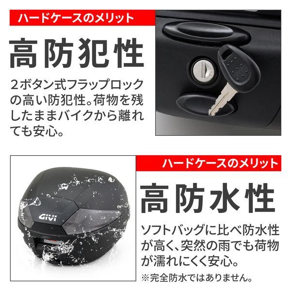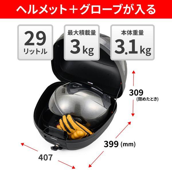 【商品説明】原付二種スクーターにピッタリなサイズ。29Lのモノロックケース。2ボタン式フラップロックにより防犯性を高めています。シンプルなデザインが車種を選ばず、多くの車体にもマッチします。モノロック用の汎用ベース付属。・ボックス外寸:奥行399×幅407×高さ309mm・内寸:奥行320×幅370×高さ303(mm)・総重量(ベースプレート込み):3.1kg・最大積載重量:3.0kg●バイク用 リアトップケース(モノロック)●原付二種スクーターにピッタリなサイズ●容量:29L、最大積載重量:3.0kg●外寸:奥行399×幅407×高さ309(mm) / 内寸:奥行320×幅370×高さ303(mm) / 重量(ベースプレート込み):3.1kg●商品構成:本体、汎用ベースプレート MP60N※ キャリア本体の積載制限以上は積載しないでください。※ 防水性を考慮した設計をしておりますが、完全防水ではありません。※ レンズ部に防水性はありません。※ 商品付属の汎用ベース、またはM6M(別売り)専用。M5M/MM(別売り)はベースラバーが接触しないため、本品には使用しないでください。※ 未塗装品は表面処理をしていないため、表面はざらざらしています。納品日より1年間。納品書必須。日本国内使用に限り保証いたします。